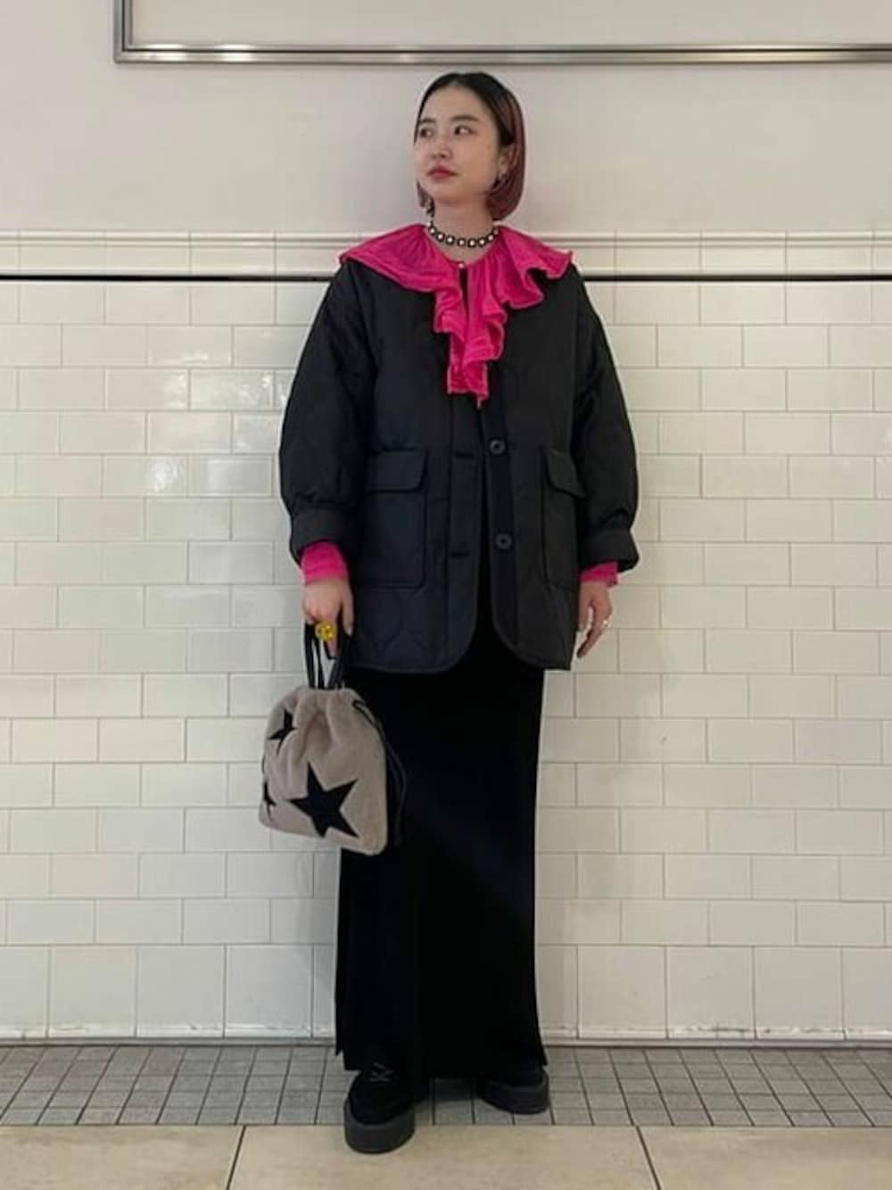 ピンク色をアクセントに、ブラックコーディネートです!キルティングアウターは、今時期とても重宝します。もっと寒くなったら厚手のニットをインナーに、マフラーを巻いたら防寒もバッチリです◎ ビームス 武蔵小杉 / コヤナギ レイ