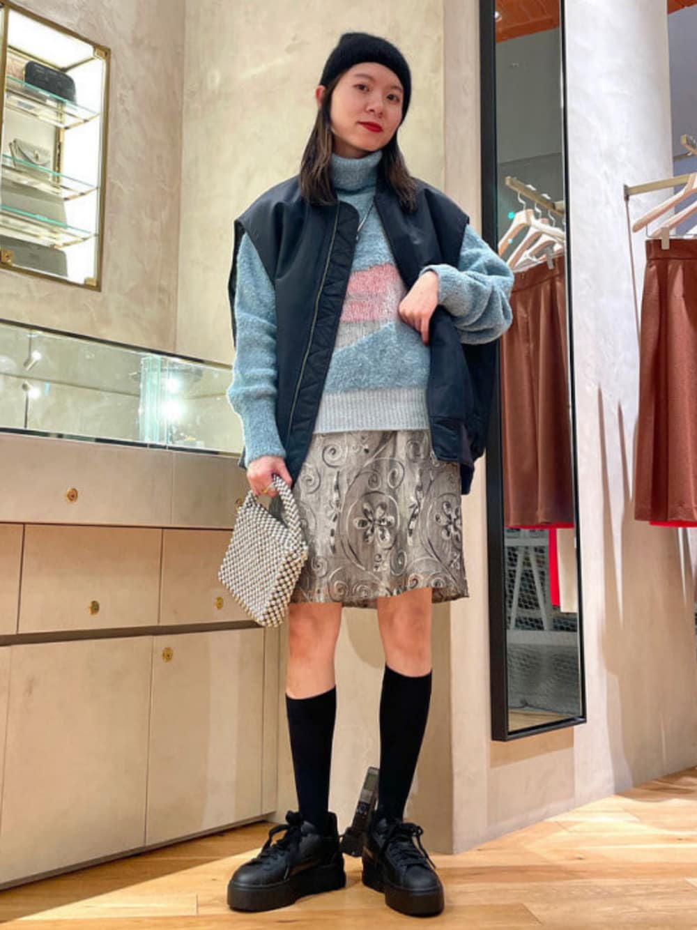 私が一目惚れしたのは、MA-1型のベスト。丸みのあるシルエットと厚手の生地感が本格的。しっかりと中綿が入っているので暖かいですし、真冬はアウターの上に重ねるのもオススメ♡女性らしく、ミニスカートと合わせてみました! ビームス みなとみらい / デグチ アツミ