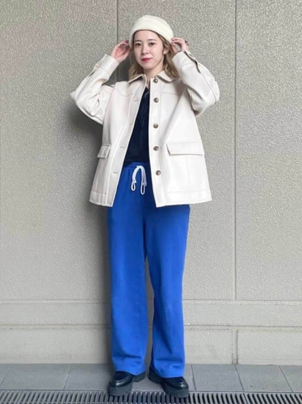 【スウェットでもお洒落に着こなし♡】リアルバイしたブルーのスウェットをルーズ感も残しながら帽子や光沢のあるブルゾンでお出かけコーデに♩スウェットを全面に出したくない方は小物使いがポイントです♡ ビームス 梅田 / フクイ サキコ