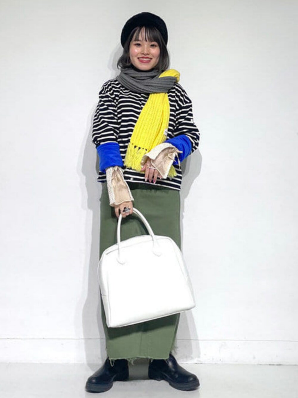 〈ORCIVAL〉の裏がフリース生地のカーディガンをメインにして、コーディネートを組みました。ボーダーと青と組み合わせがとてもかわいいので、袖に更にかわいさをプラスし〈RBS〉のトップスとレイヤード☺︎白のボストンバッグで明るさをプラスしています◎ ビームス ストリート 横浜 / 沼田 まどか