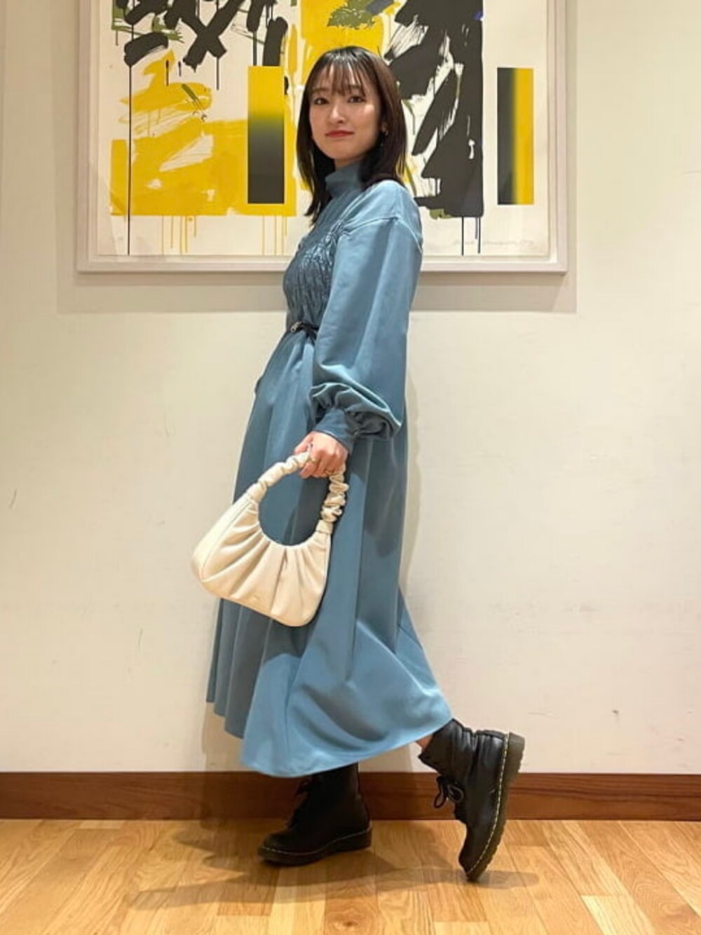 シンプルなワンピースは、一枚で着ても可愛いですが、ベルトをキュッと閉めて着て、こなれ感を出してます! 上品なブルー小物やアウターはあえて淡い色を合わせて全体的に明るくしてます!胸周りはゴムでとっても伸縮性があります◎ ビームス 二子玉川 / 松本 佳菜子