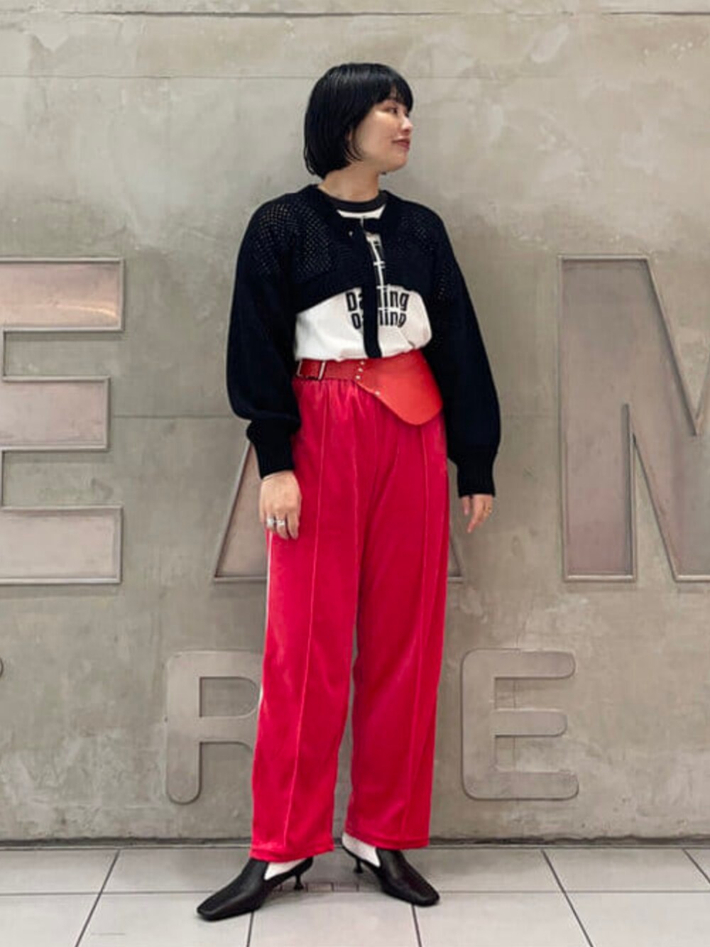 【赤!黒!】とパキッとした色を合わせました。少しいなたく、体操服っぽさを意識しました☆彡リンガーTシャツと、アームボレロは、1着持っておくと便利ですよ〜!パンチが効いてるベルトは、ワンピースに合わせるのもオススメです。 ビームス ストリート 梅田 / にしい まな