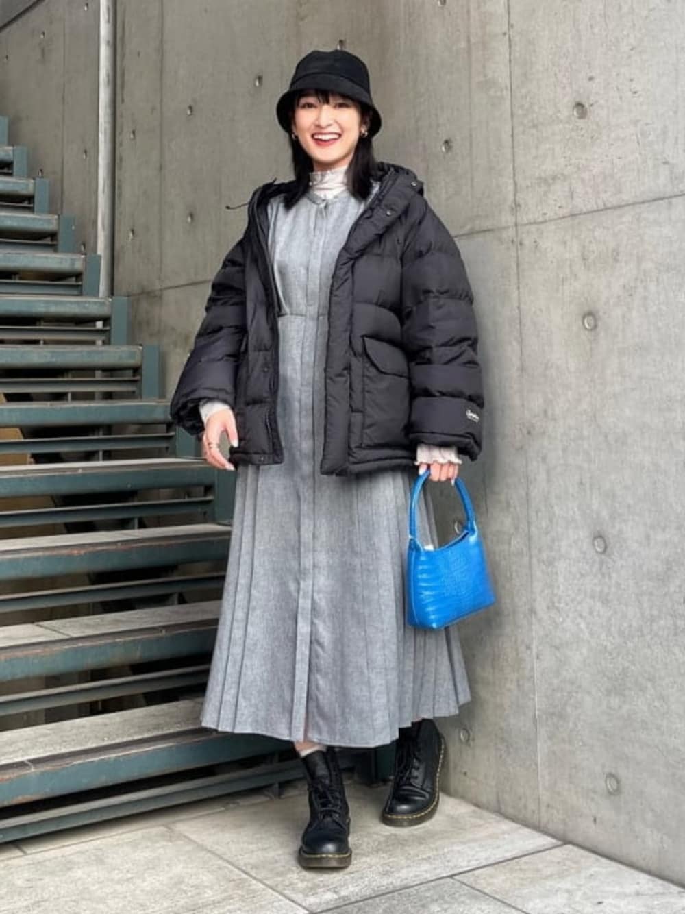 【おすすめダウン】綺麗めワンピースにも合うおすすめのダウンです♡ブランドロゴの主張があまりないので色々なスタイルにあいます◎ワンピースはかなりゆったりとした身幅です!!プリーツが高めの位置にあるので足長効果もあります♡ ビームス 二子玉川 / 松本 佳菜子