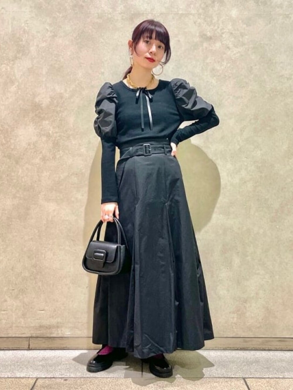 【ALL BLACK】珍しく全身黒!重たく見えすぎないように、光沢感のある素材やレザー小物で軽く見せたところがポイントです♪新作の鎖骨が綺麗に出るスクエアネックのカットソーは、肩のギャザーがエレガント♪ブラウスのような生地感なので、アウターを羽織っても嵩張りません◎スカートは腰回りはスッキリで、裾にかけてのタックの入り方がとにかく綺麗…!女性らしいディテールのアイテムで組みましたが、ブラックでかっこよくモードな雰囲気のスタイリングにしました! ビームス みなとみらい / デグチ アツミ