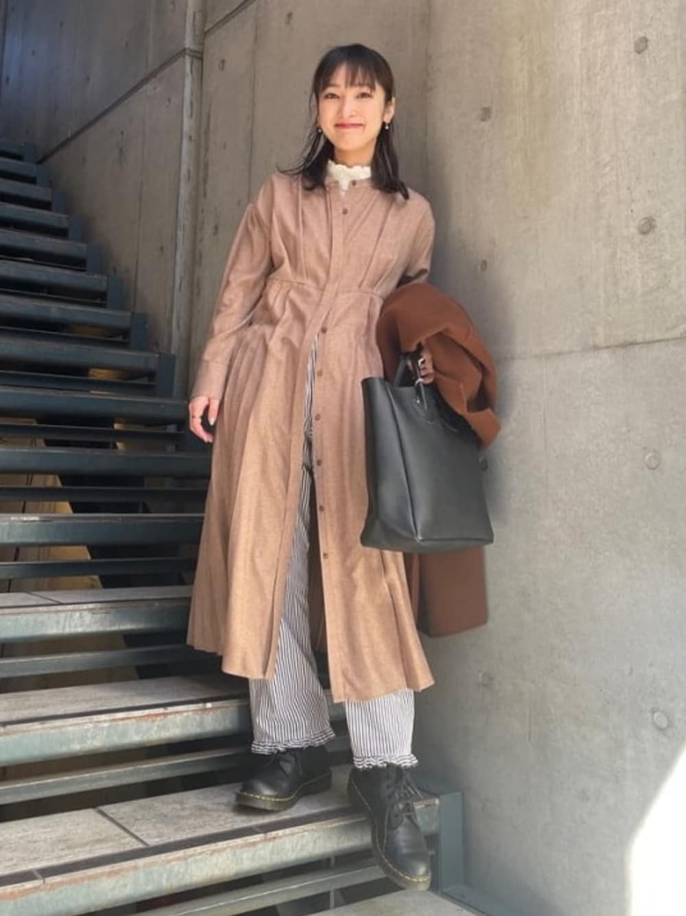 【大人カジュアル】大人カジュアルスタイルを意識しました!普段ヒールを履いたりしないので、大人っぽさにカジュアルを混ぜてます。ワンピースは閉めて一枚で着るのも良いですが、羽織として着るのもおすすめです! フリーサイズなので試着無しでも購入いただけます◎春まで着れるのでSALEのお得な時期に購入しちゃってください★ ビームス 二子玉川 / 松本 佳菜子