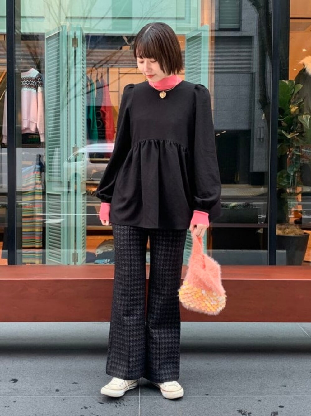 新しく入荷してきたブラウスは形がとっても綺麗!ピンクのチュールハイネックとレイヤードしました♡チドリ柄のフレアパンツと合わせて全体的にブラックに♪差し色のピンクが推しポイント!シャギーバッグはなかなか無いデザインで目を引く一点ですね♡ 【"♡+"をポチッとチェックして頂くと、アイテムを見返しやすくなります。ご利用下さい!!】 ビームス 金沢 / 松栄 由理