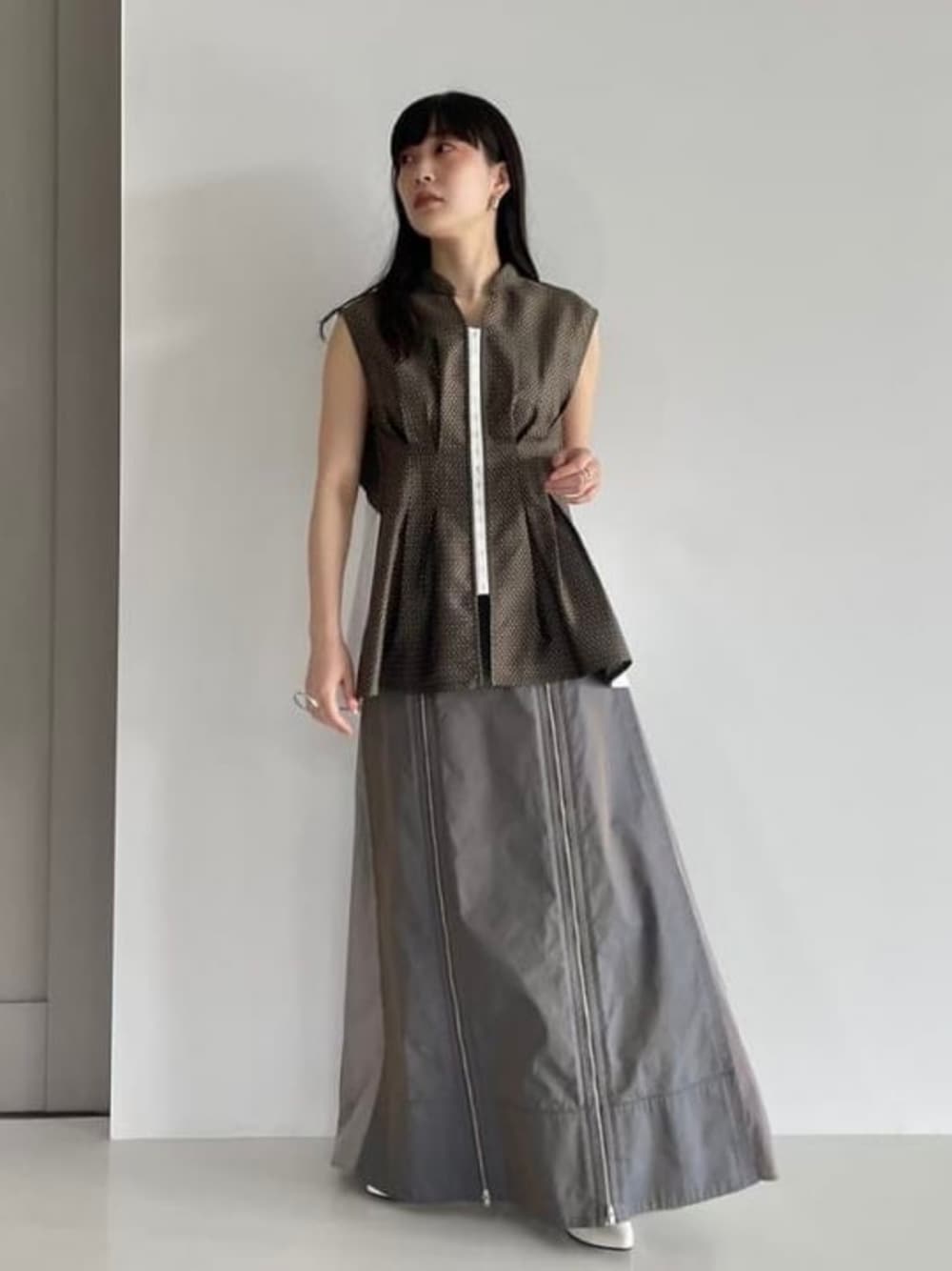 【RBS 2nd Delivery予約受付中!】 機能性はもちろんデザインとしてのホックとジップがポイントのコーディネートです。くすみカラーを活かす為に差し色は白にしました。トップスが特徴的な形なので、スカートのジップは全閉めでバランスをとっています。生地感が珍しいアイテムはコーディネートの幅がぐっと広がるのでおすすめです! Ray BEAMS / pin