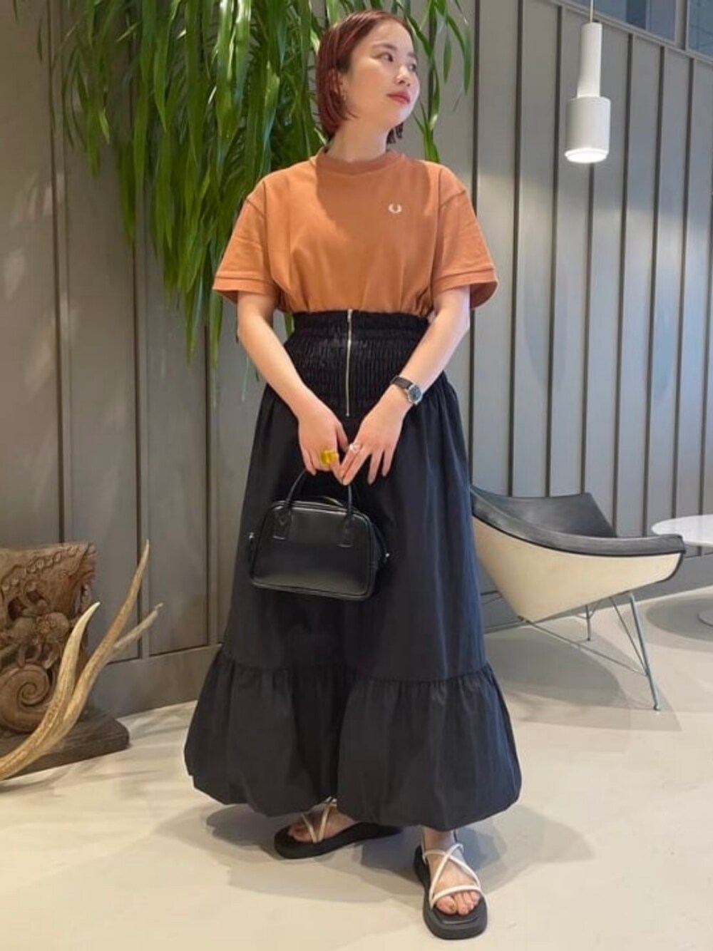 さらりとした生地が着ていて気持ちいい<FRED PERRY>のTシャツは、昨年即完したアイテムです!私はタックインをして、すっきり着てみました。新色のライトラストは、是非大人の女性に着て頂きたい上品なカラーです◎ Ray BEAMS / コヤナギ レイ