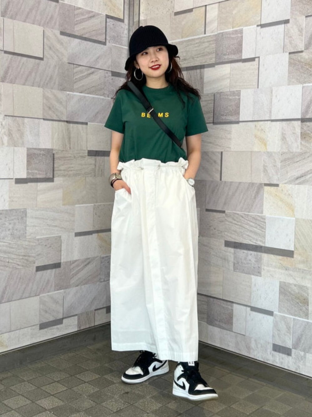 【BEAMSロゴTの新色!】深めのグリーンがいい色です♪ 170cm Sサイズ着用でこんな感じのサイズ感!分厚すぎず、薄すぎないちょうど良いコットン100%!スカートは白なので若干透け感があります!インナーの色は注意したほうがいいかもしれません◎こんな格好をして天気のいい日は散歩したいです〜!! ビームス 横浜東口 / ゴメス
