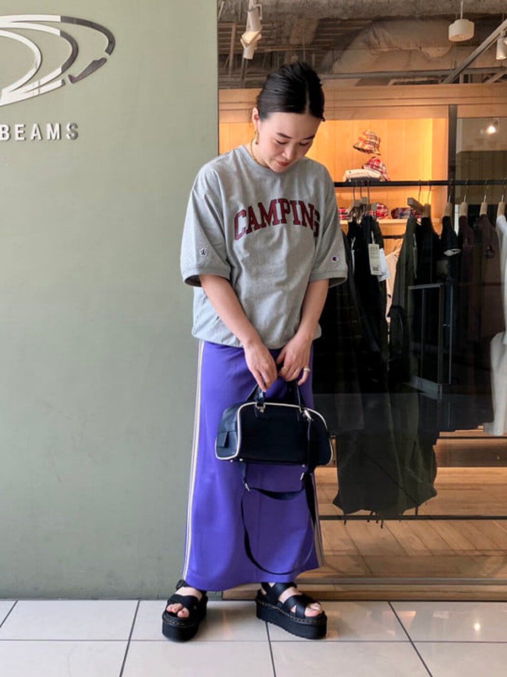 【大人女子に薦める、スポーティアイテム。】皆様こんにちは、溝口です。今回は大人女子にも着られる、スポーティなアイテムのご紹介です。まずはトップス。Tシャツ生地程ペラペラしておらず、スエット程地厚ではないBEAMS BOY別注<Champion>の半袖です。ボディのグレーカラーに、暗めの赤文字ロゴがカジュアルながらも落ち着いて見えます。ボトムはあまり暗い色にし過ぎると地味に見えてしまうので、少し明るめのパープルを。こちらはRay BEAMSオリジナルのジャージスカートです。サラっとした生地感が心地良く、タイトなシルエットはどんなトップスとも相性が良く気回せます。パープルなのにいやらしくならないのもポイントですね。オーバーサイズを取り込まない事で、スポーティなアイテムでも女性らしくスッキリ着こなす事が出来ます。<Dr.Martens>のサンダルは、もう夏の定番。普段24.5cm着用の私は38のサイズを履いていてピッタリです。トップスはS、ボトムは1のサイズ着用。少しでも、皆様のお買い物の参考になれば幸いです! ビームス 町田 / 溝口 慶