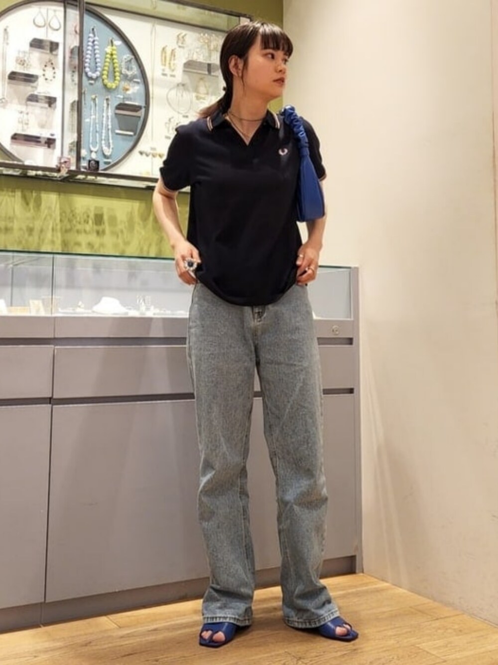 個人的にポロシャツはシンプルにデニム合わせが好きです。Web限定の<FRED PERRY>のポロシャツ、ネイビーでシンプルなのですが、よくよく見るとラインや刺繍がピンクなんです!こちら推しポイント◎スニーカー合わせも可愛いのですが、ちょっぴりレディライクに魅せるのが気分なので足元は<REMME>のミュールを合わせました!襟元はボタンを外してネックレスを見せると華奢見えかつ、抜け感が出るのでオススメです。 レイ ビームス 新宿 / saori KATO