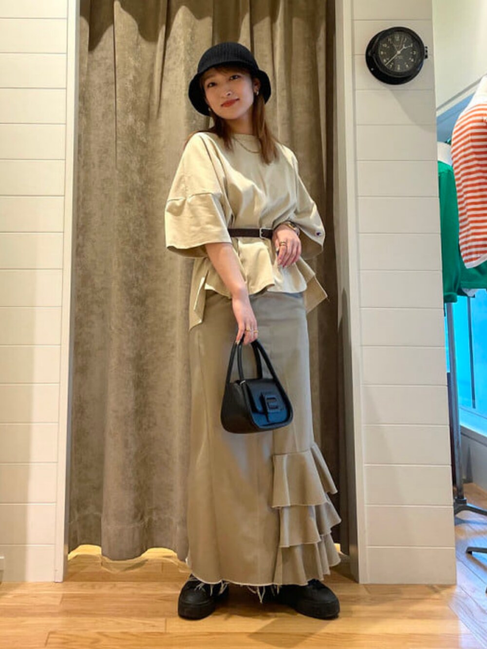 【背景と同化してしまいました笑】背景と同化してしまいまして、写真をじっくり見ていただけると嬉しいです♡笑Tシャツ、スカートどちらも同系色でまとめて、ワンピース風に着てます。ウェストをキュッと絞ってスタイルよく見せているのがポイントです。ベルトをとっても可愛いビックTはこの夏おすすめのアイテムです★! スカートは一点ものになってますのでwebでの販売はございません。ご気軽にお問い合わせください★(商品番号:6127-0127) ビームス 二子玉川 / 松本 佳菜子