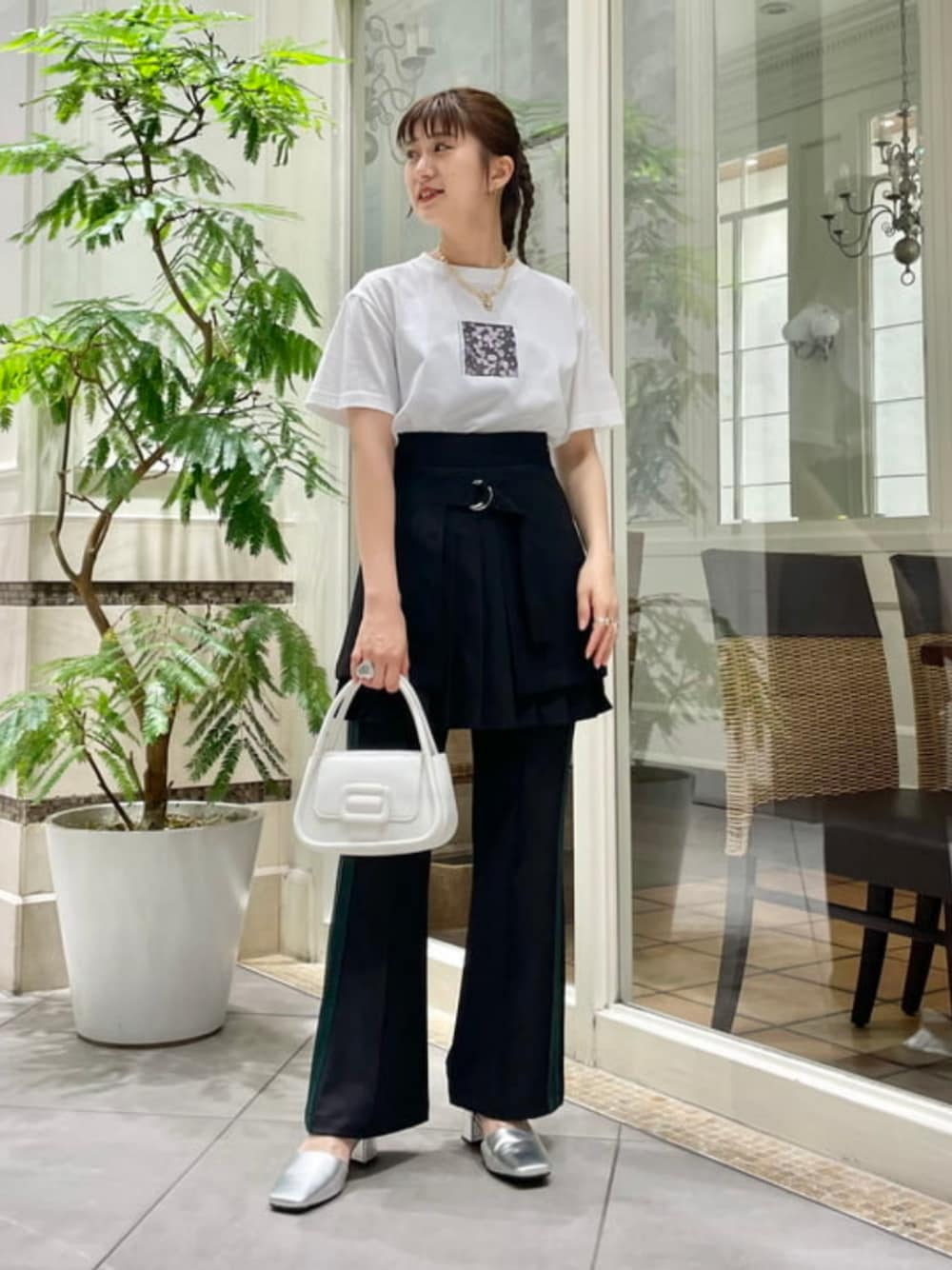 すっきり見えるパンツに、スカートのレイヤードが今の気分です♡スカートは158㎝でサイズ1を着用しています!Tシャツは大好きなフラワー柄♡サイズ感も小さ過ぎず、着やすいです♪ Ray BEAMS / 南井 菜摘