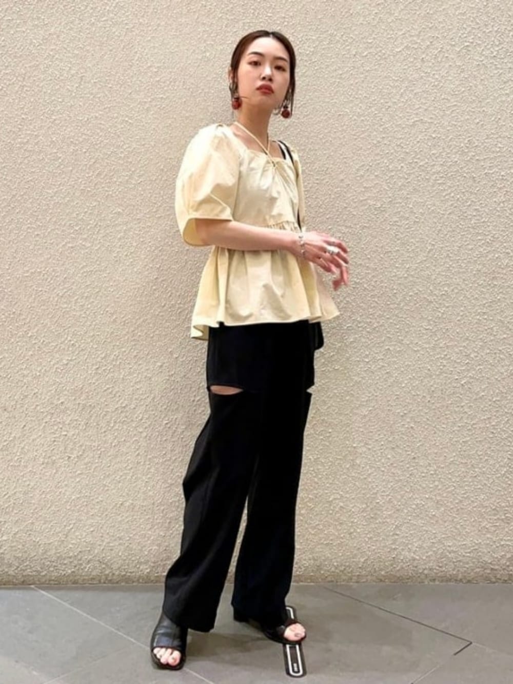 【待ち望んでいたパンツを主役に♡】<Ray BEAMS>サイド カットアウト パンツはカタヤマリアルバイアイテム!入荷前から「絶対買う!」と決めておりました◎パンツ単体で見ると少しモード感のあるアイテムなので、トップスは少し甘めなブラウスをチョイスして女性らしさをプラスしました!ブラウスは前後どちらから見ても可愛いデザイン…♡バスト下の切り替えがスタイルアップを叶えてくれますよ〜! ビームス 新宿 / カタヤマ アヤ