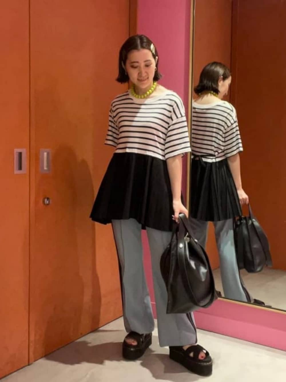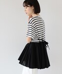 【身長156cm】キリカエシの裾がプリーツになっているこちらのボーダーTシャツ!お尻が隠れるくらいの丈感が嬉しいですね♪アクセントにネックレスとパンツでカラーを入れました◎ ビームス なんば / ミウラ