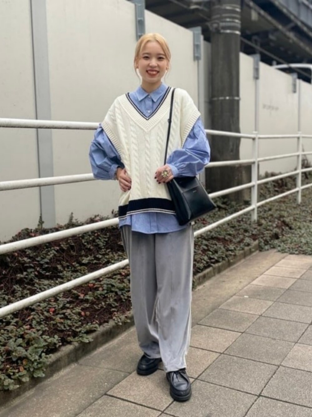 【FRED PERRYのベストお気に入りです♡】Ray BEAMS別注の〈FRED PERRY〉のニットベストを使ったスタイリングです!ベストとシャツの組み合わせは、王道ですがやっぱり可愛いくて私の好みです!♡今回は、同じく別注の〈PENNEY’S〉のベロアパンツと合わせて、トラッドスタイルの中にトレンドアイテムを1点投入しました!このバランスも好きです^^♡抜け感が出過ぎない様にバッグやアクセサリーは綺麗めなアイテムを合わせました!下の商品画像をタップすると購入できます^^!【♡+お気に入り】をタップすると、アイテムを見返しやすくなりますので是非ご活用ください! ビームス 千葉 / みまた かお