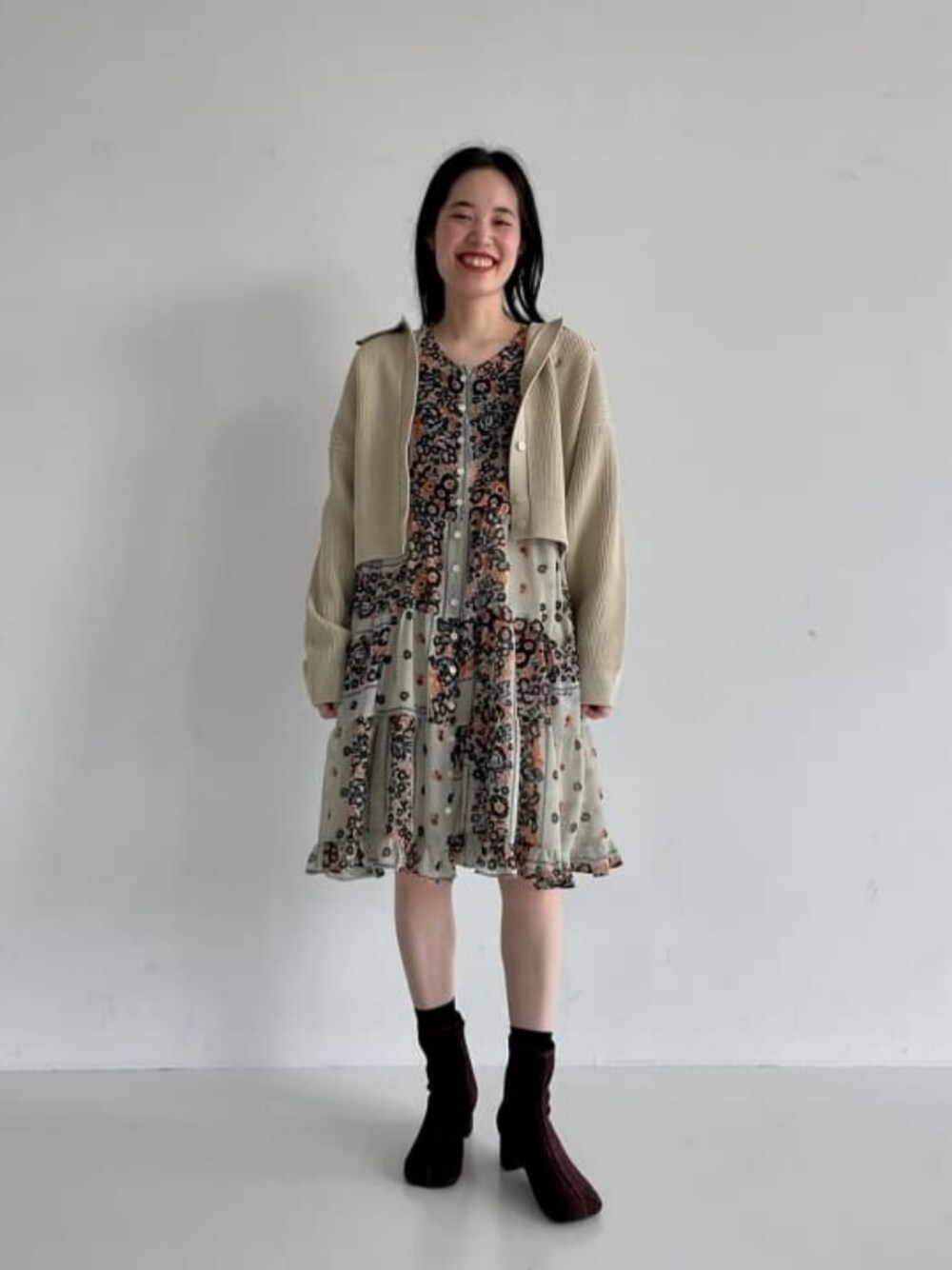 ワンピースに羽織りをプラスしたコーディネート。キラキラ輝くブラウンのブーツでオシャレ感をプラス。 ビームス 恵比寿 / ナオミ