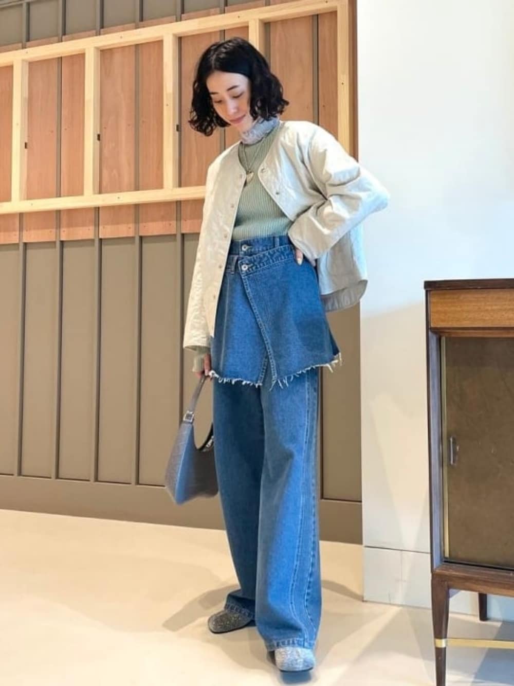 1番のお気に入りはこのデニム♡可愛すぎる!トップスをシンプルにしてもオシャレなスタイリングに!なのでシンプルなデザインながらも使いやすい丈感、厚さの〈ORCIVAL〉のアウターを合わせました!この軽さと少し広がってる袖、少しゆとりのある身幅がオススメポイントです♡ Ray BEAMS / えみり