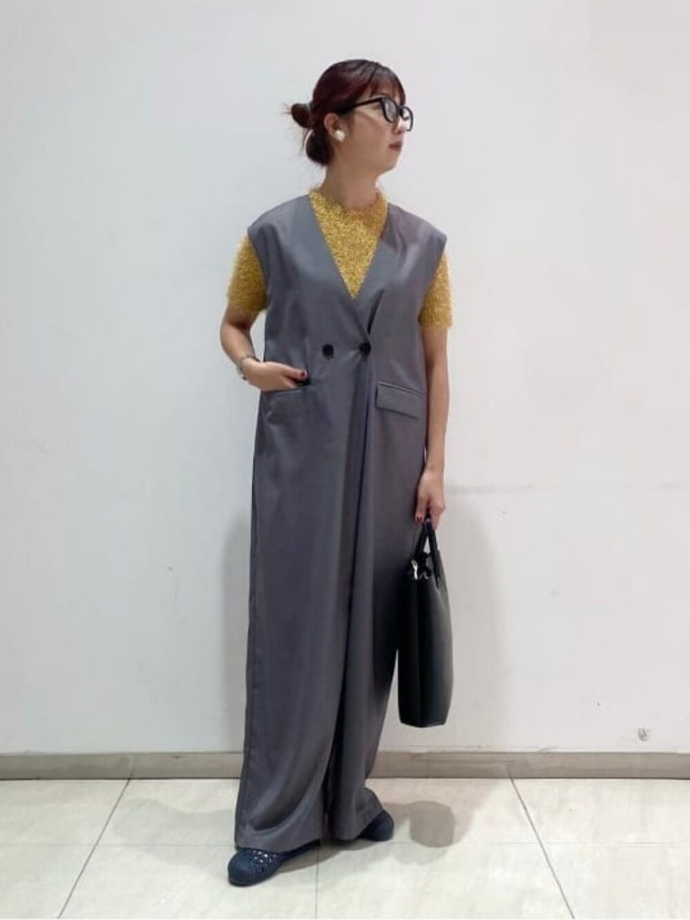 深めのVネックにゆとりあるシルエットのサロペットフロントは2つボタンでスッキリと。体のラインを拾いにくいアイテムとなっております。中は少しタイトめな半袖ニットで合わせました。 ビームス 鹿児島 / ユリやん