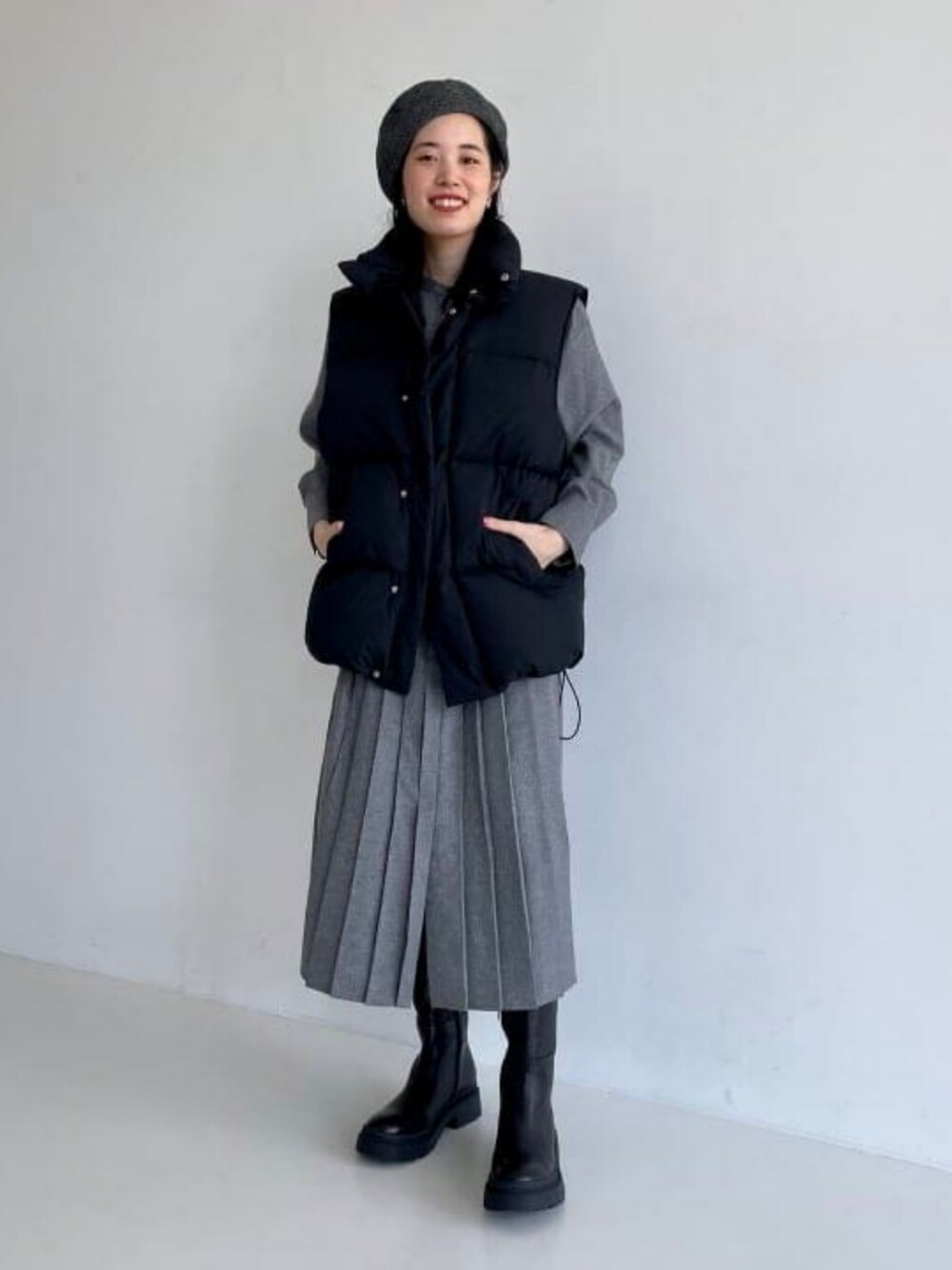 グレー×ブラックのクラシックコーディネート。ワンピースにロングブーツとダウンベストで少しハンサムな印象をプラスしました。 ビームス 恵比寿 / ナオミ