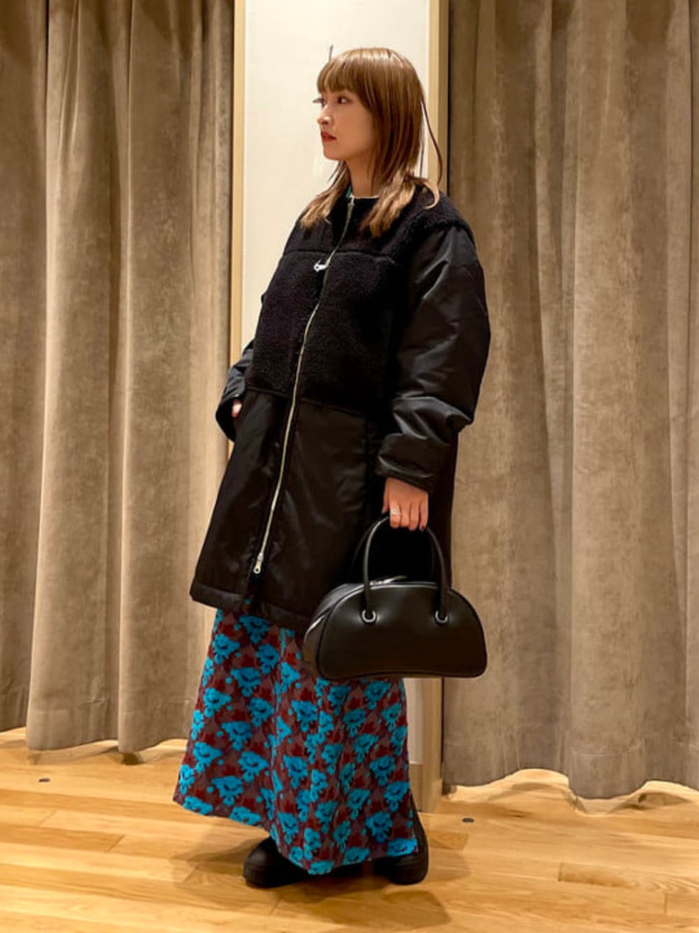 アウターはとってもシンプルなものを合わせました!中でギュッと絞るとよりスマートに切ることができます。スカートは身長163cm、サイズ1を着用してます。 Ray BEAMS / 松本 佳菜子