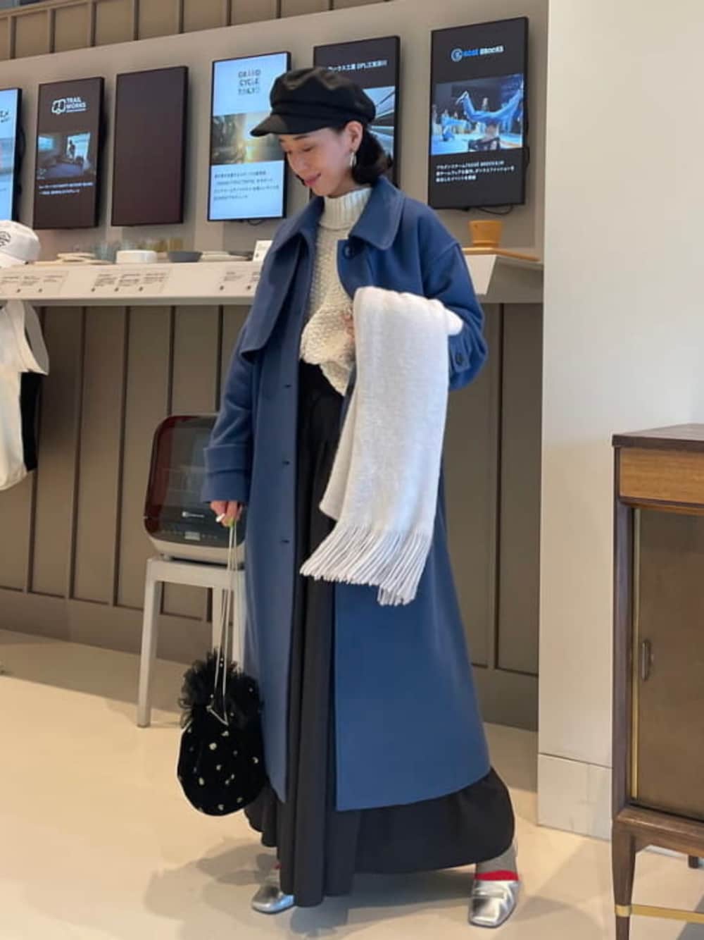 【 Ray BEAMS23AWを先取り】少し霞んだカラーのブルーは合わせやすく、また中々ないカラーなので、落ち着いたカラーのアウターに飽きた方にはぴったりです♡丈感も丁度いい長さでロングスカートと合わせてもバランス良く着て頂けます♪トップスのニットは首元のカットが重たくなりがちは冬のスタイリングに抜け感を出してくれます! Ray BEAMS / えみり