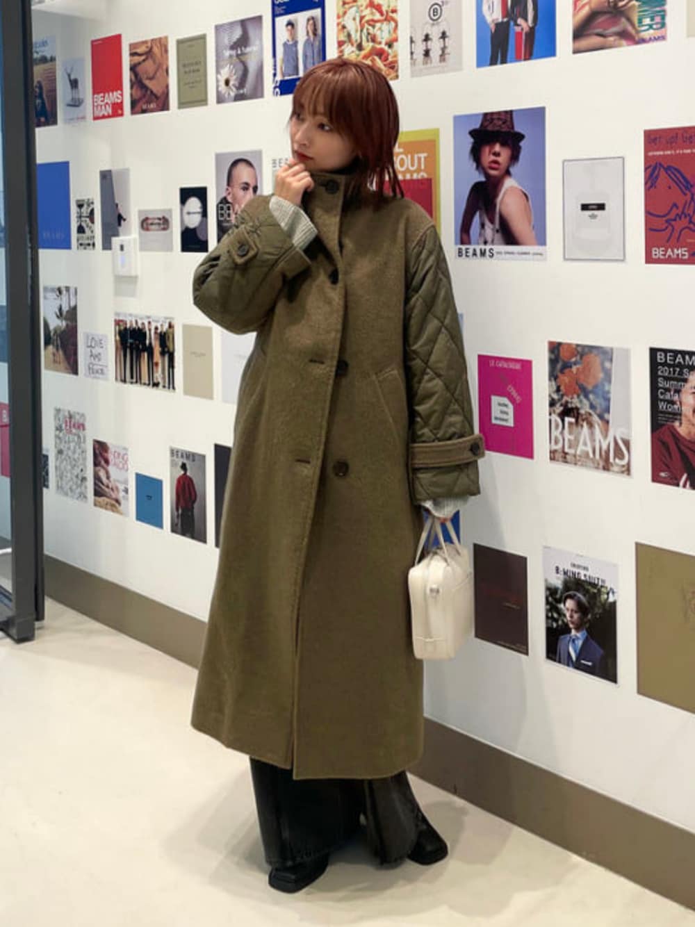 【RBS】シンプルだけどかわいい、アウターとニットはRBSのものです。去年から人気のスタンドカラーのコートは、襟を寝かせてきてもおしゃれです◎袖とボディの素材違いがオシャレに見せてくれます。身長163cmサイズFREEを着用してます。 Ray BEAMS / 松本 佳菜子