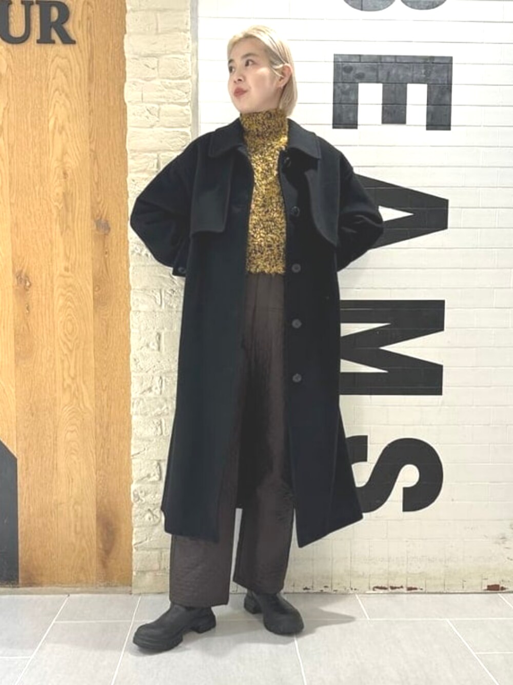スタンドカラーと2wayで着れるステンカラーコートを♡イエロー×ブラウンの大好きな色合わせに、ブラックのコートで締めました! ビームス 新宿 / Nagumo Yuki