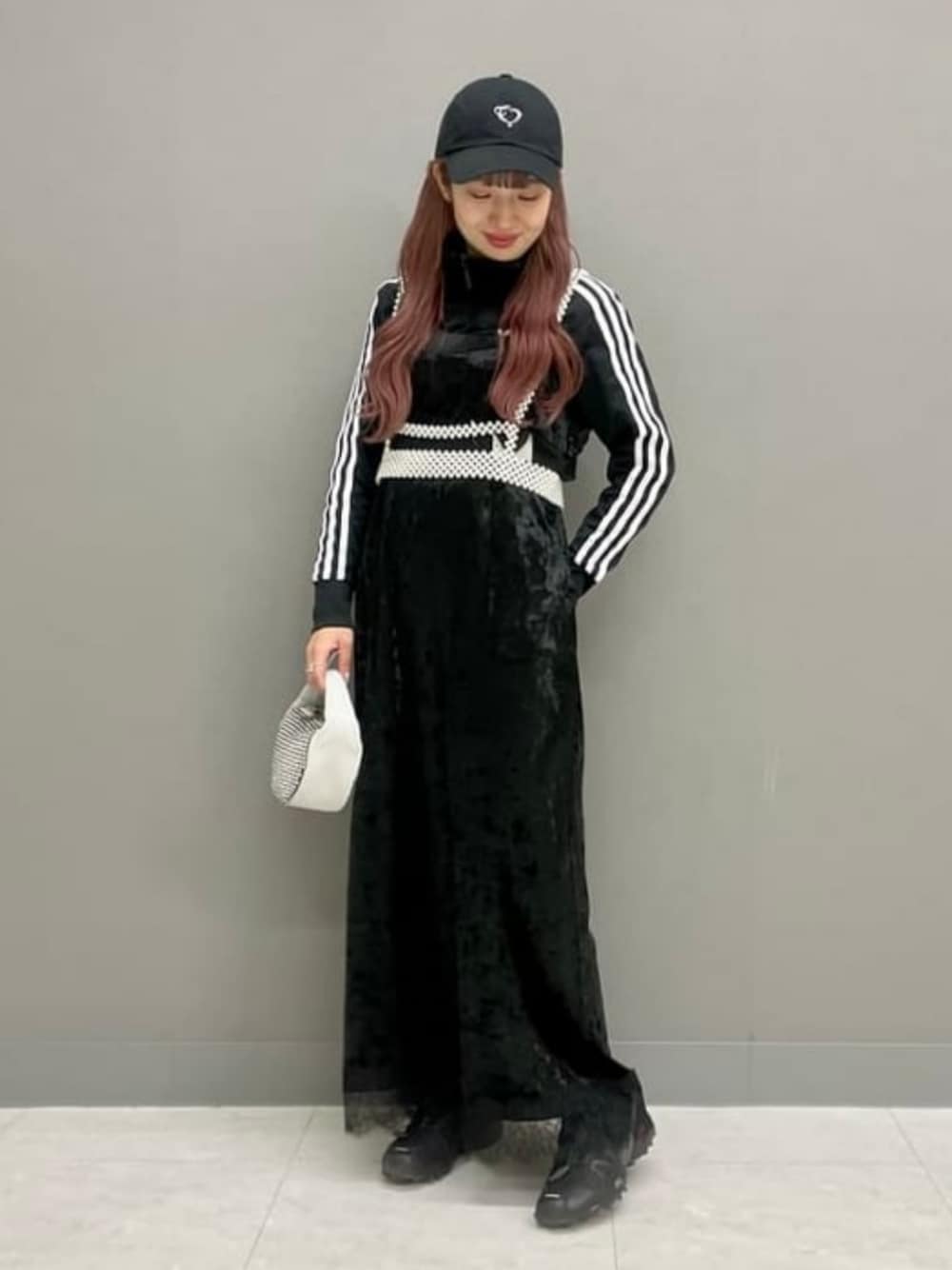 【スポーティーMIXも楽しめます!】店頭でも大人気なワンピース!少し長めに着たかったので本日は153cm/size1を着用しております!肩紐部分にはアジャスターがついているため、丈の調節も可能です◎オールブラックでまとめましたが、ワンピースはベロアなので素材感の違いも楽しめますよ〜!上からハーネスを付けることで低身長でもスタイルアップが叶います◎ ビームス ストリート 横浜 / ヒカリ