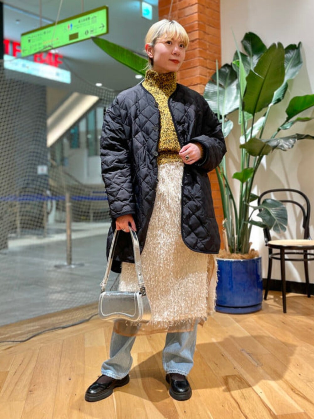 デグチ アツミ デグチ アツミ H:162cm 2023.12.05 【ダウンなのに驚く軽さ!】ダイヤ型のキルティングが上品な、〈GYMPHLEX〉のダウン入りコート。ヒップをすっぽり隠してくれる安心感がありつつも、前後差があるデザインで、前はすっきり見えするので、ボトムスのシルエットを選びません◎身長162cm、インナーに肉厚なニット合わせで14のサイズを着用していますが、ゆったりサイズなので12でもストレスフリーで着用できました!ニットとスカートは、アウターの下でもバッチリ映える、色と素材感が華やかなものを。コートで隠れてしまうけど、中に着るアイテムもこだわりたい♪ ビームス みなとみらい / デグチ アツミ