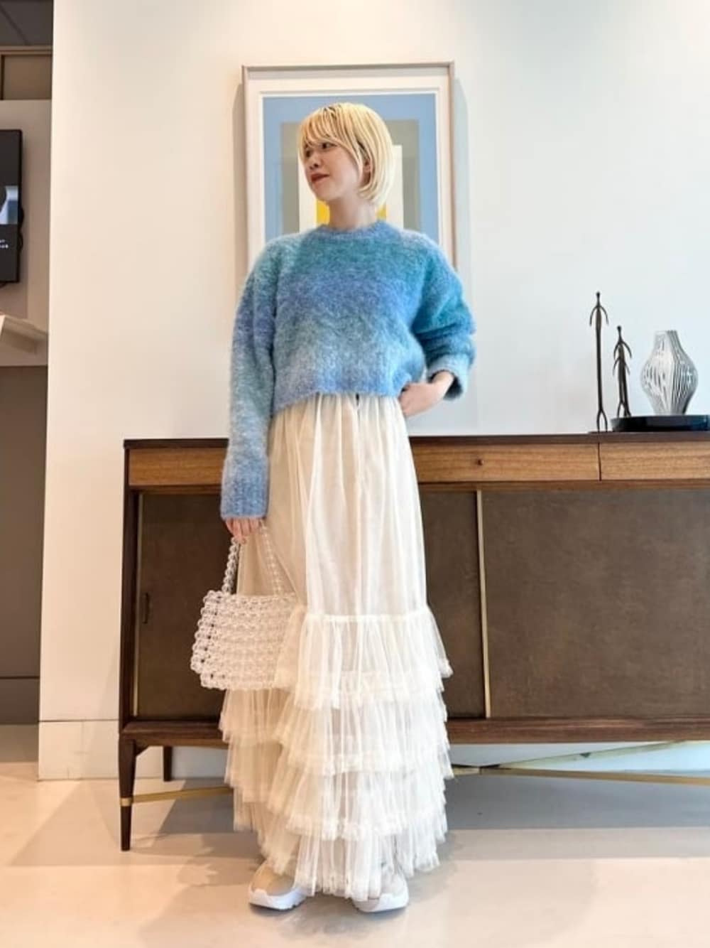 昨年も大好評だったグラデーションニット!今年は私の大好きなブルーが登場♡お出かけしたときにも写真映えするデザインとふわっふわで気持ちの良い肌触りがたまりません!旅行にも持っていきたい1枚です! Ray BEAMS / ハルヒ