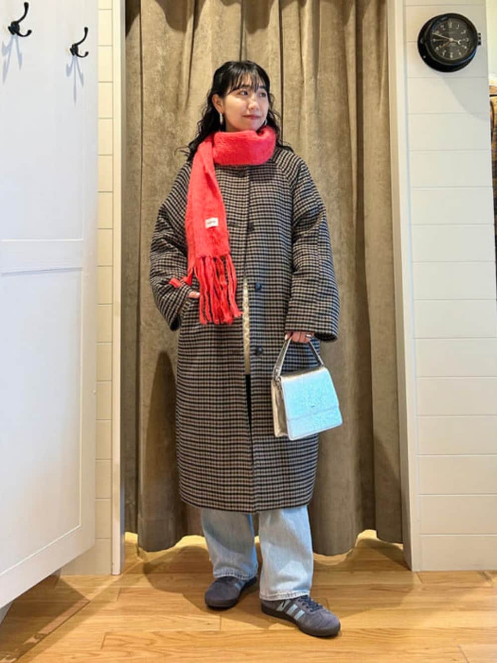 季節感の出る柄のコート一つは欲しいですよね♡私が着用してるチェック柄のコートもSALE対象品です!身長157cmでサイズ0を着用してますが、中に厚手のニットを合わせても着膨れしないです!スタンドカラーでシルエットもスッキリとしてます◎ ビームス 二子玉川 / SAE