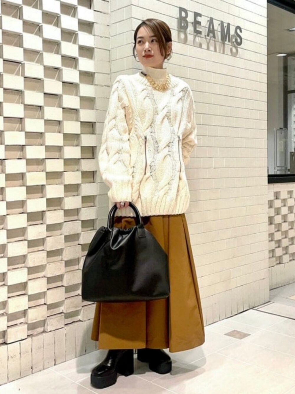 スカートを主役にたっぷりめのニットを合わせて今時期にオススメなコーディネートを組みました♪スカートはAラインシルエット&かなり軽いのでストレスフリーで履けちゃいます!ニットは実はフロントのZIP部分で若干シルエットが変えられるギミックが…!ZIPを閉めると少しスッキリしたシルエットになるので、スカートに合わせて閉めてみました◎パンツスタイルにもオススメの着回し力が高いニットですよ〜! ビームス 新宿 / カタヤマ アヤ