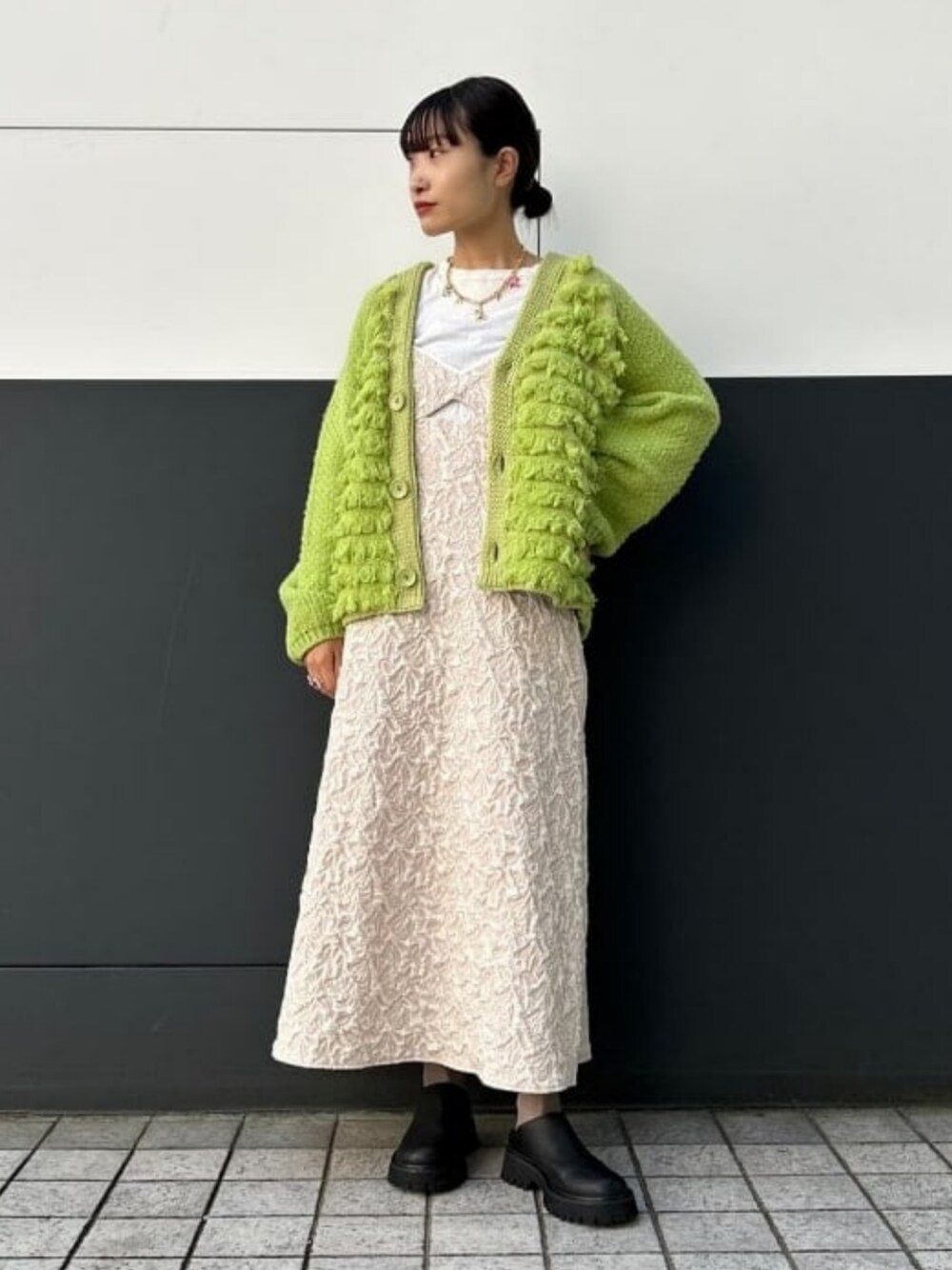 <BOUSSOLE × Ray BEAMS>の別注カーディガンを着用! ワンピースが細身のシルエットなので、ざっくりとしたカーディガンを合わせました! パキッとしたライムのカラーが目を惹きます◎ ビームス 広島 / 川崎 礼