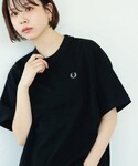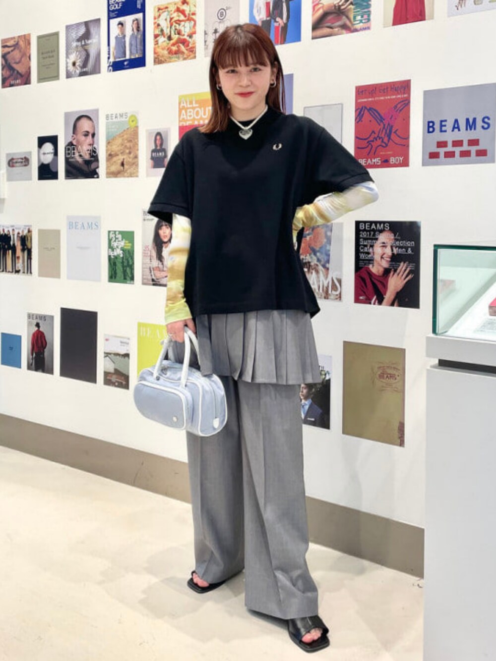 〈FRED PERRY × Ray BEAMS〉の人気Tシャツは、前が短め後ろが長め、のAラインシルエットで1枚でもさまになります!かなりゆったりめなので、重ね着しやすいのも嬉しいポイント。私はシアーのTシャツと合わせました♡ボトムスは、今年も引き続き注目しているスカートオンパンツ。こちらはスカートとパンツ別々なので、デニムなどお持ちのボトムスと合わせていただくのも◎個人的にはシルエットも好きですが、ウエストのメタルパーツが可愛くて狙っています♡サイズはどちらも1サイズを着用。基本長めが好きなので大きめを選ぶ事が多いのですが、パンツは靴にヒールがないと地面スレスレなので、160cm以下の方は0サイズが良さそうです。ウエストも細身過ぎず、お尻〜太もも辺りもゆったりなので、腰回りが気になる方も着ていただけるかと思います! Ray BEAMS / 田中 里実