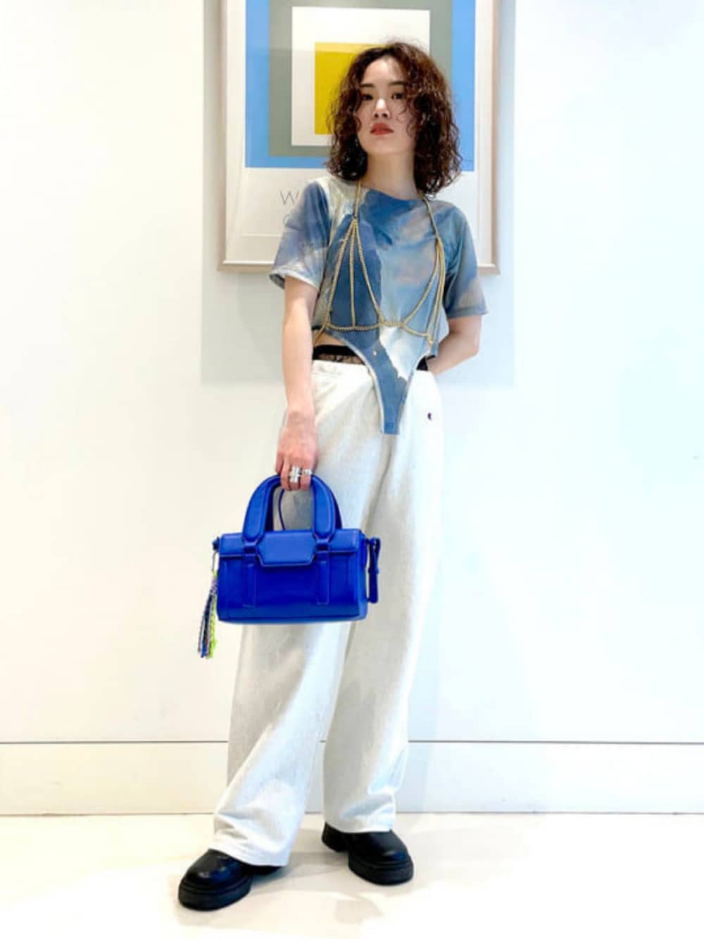 プリント ボディスーツ Tシャツは個人的にも楽しみにしてるアイテム!インナーとしてはもちろん、レイヤードスタイルにも大活躍!<Champion × Ray BEAMS >のスウェットパンツでスポーティ要素をプラスしましたが、チラッとストッキングを覗かせたのがポイントです◎ Ray BEAMS / カタヤマ アヤ
