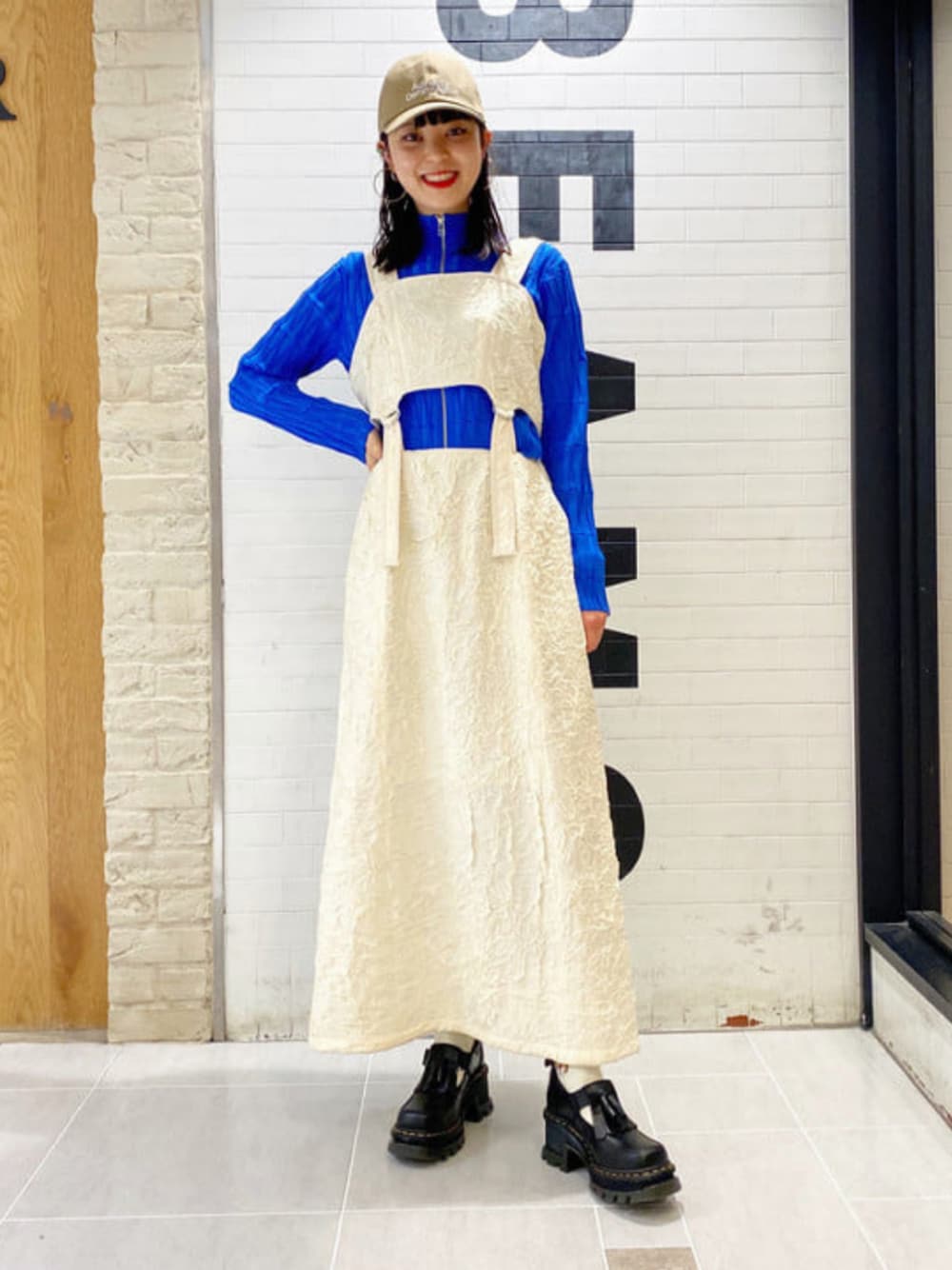 実は少しラメ感のある生地!ガードルみたいなベルトのデザインも可愛いです!ブルーのインナーを合わせるとパキッとしていい!シューズは大好物〈Dr. Martens〉です。今回もかっわいいっっっ!!! ビームス 新宿 / りかちょび
