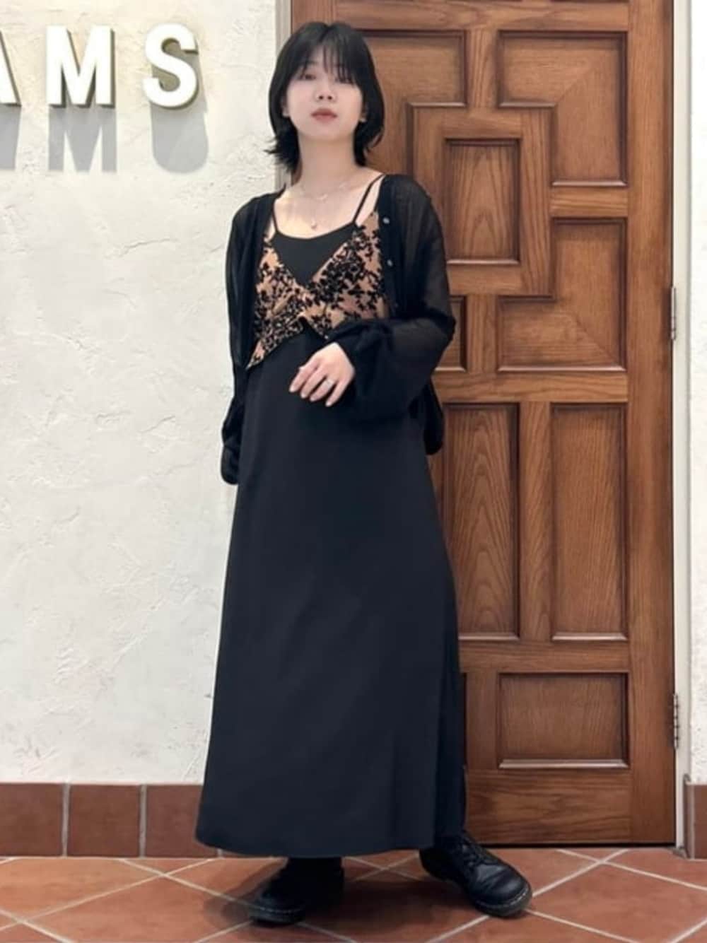 【シンプル・シック】158cm・Sサイズ多め。フリルのビスチェ風デザインが目を惹くワンピース。たまにはこんなスタイリングも~。美味しいご飯食べに行く時、ちょっと背伸びしてみようかな、なんて想像しながら。笑上が軽めなので足元は革のブーツやごつめのスニーカーにするとバランスとれそうです。パンプスやヒールで女性らしくするのも素敵です~◎◎ ビームス 吉祥寺 / 朱音