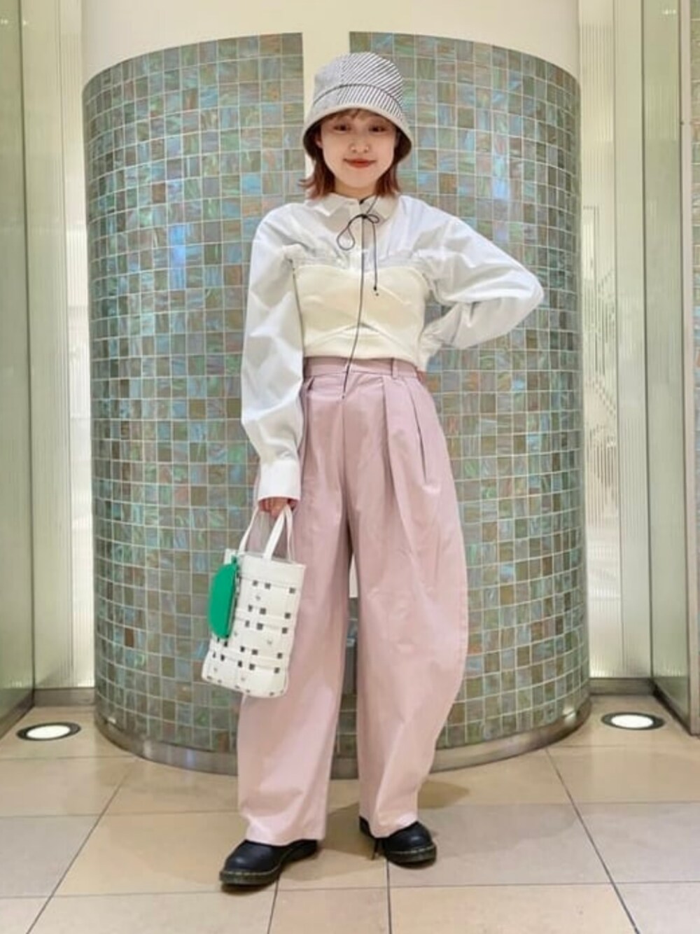春っぽピンクで爽やかに!ボテっとオーバーシルエットのパンツには、タイトに締まるトップスをチョイス。ビスチェはシャツの上から重ねました。Tシャツなどに重ねた方が滑りにくくいいかもしれません^ - ^笑 日差しも気になるのでハットも♩ Ray BEAMS / カラツ ミナ