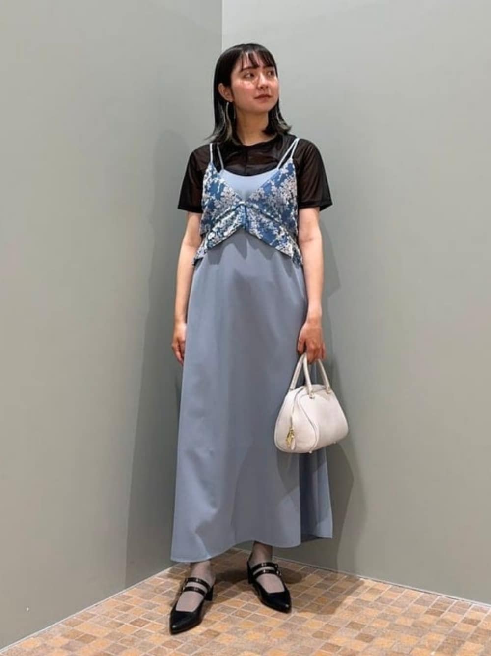 本日はお呼ばれコーディネートです。ポージングするの忘れました。オパールデザインが華やかで素敵なワンピース(サイズ1)をメインに、シアートップスを合わせてきれいめにまとめてみました。インナーは白と迷ったのですが、ブラックでシューズと合わせたことで全体が引き締まるようにしています。バッグはあえての白で女性らしい柔らかい雰囲気を持たせています。私は丈を長めに着たいので、サイズ1にしましたが、肩紐がアジャスター付きで身幅も余裕があるので161cmくらいであればサイズ0でも良さそうです! ビームス 池袋 / ao