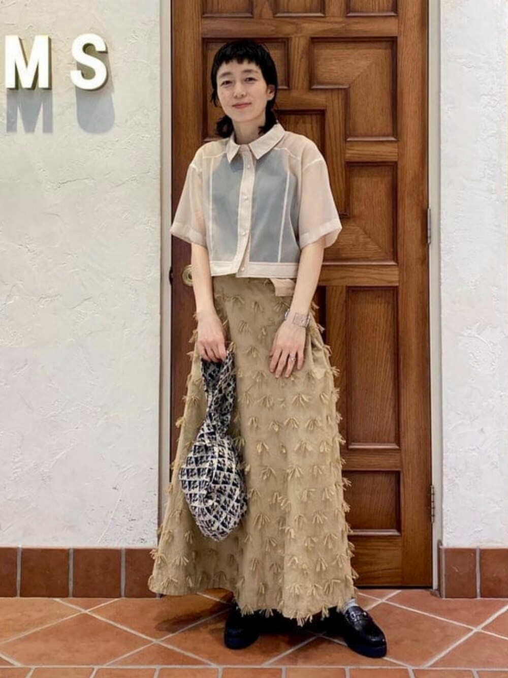 【ベージュワントーンコーデ】ブラックをうまく効かせてスタイリングしました。シアー素材は今シーズンもマストアイテムですが、こちらのシャツは短丈で他のアイテムとバランスも取りやすく おすすめです! プリントTの上から羽織として使っても◎ ビームス 吉祥寺 / クスノセ (43)