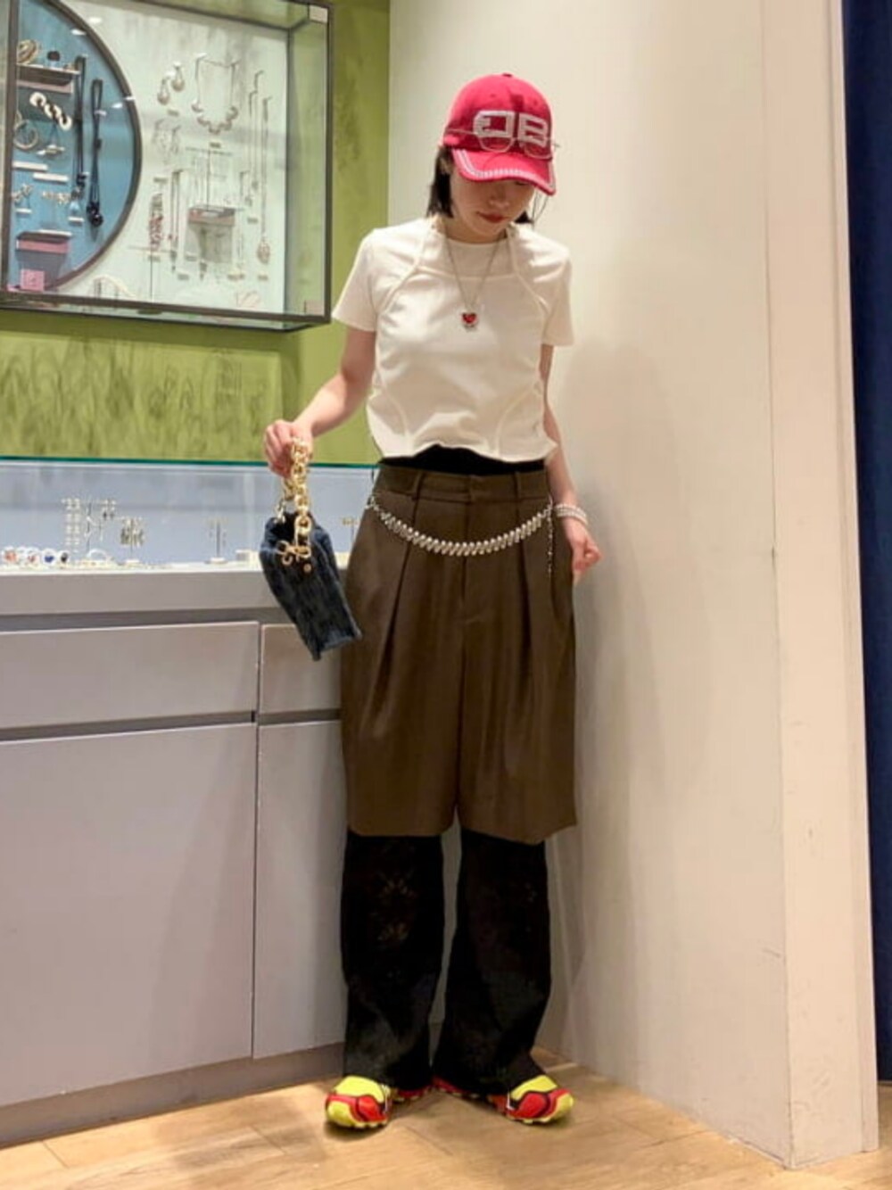 シンプルなパンツをレイヤード。新鮮な気分〜勿論別々で着用してもキュートなアイテムです。どちらもサイズ1着用、気持ちゆとりのあるサイズ感でした。小物にパキッとしたカラーを盛り込む時は、お洋服はできるだけシンプル。がマイルール♡ レイ ビームス 新宿 / おミツ