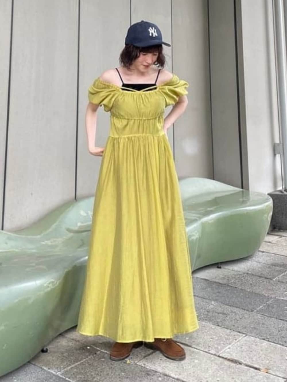 女子っぽくなり過ぎないようにキャップ合わせを!♡パフスリーブ大好きなのですが、私は肩幅が強調されるのは避けたいので・・・ゆるっと肩の部分を下ろしてオフショル風に♡何と言っても後ろ姿が綺麗なんです~~!2色展開で、もう1色は黒でございます◎胸元は開き過ぎないようにお気に入りのベロアのキャミソールを! ビームス 東京スカイツリータウン / tamura arisa