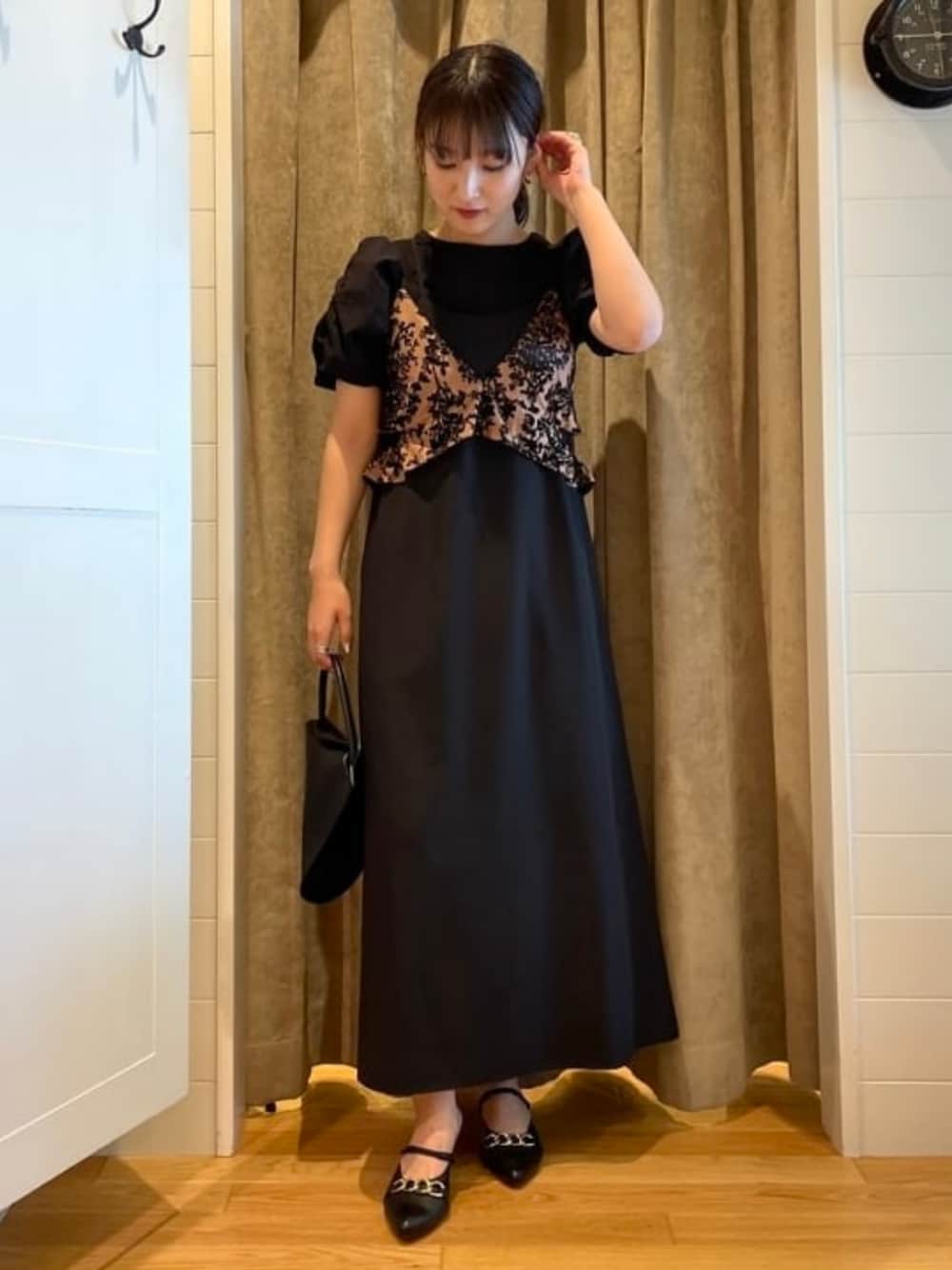 【重ね着しているみたいなワンピース】まるで重ね着しているかのようなキャミワンピース♡!パフスリーブのTシャツを合わせて全体的にブラックでまとめました!胸元の花柄が目立つように意識しました!長さは肩の紐で調節できます★ ビームス 二子玉川 / 松本 佳菜子