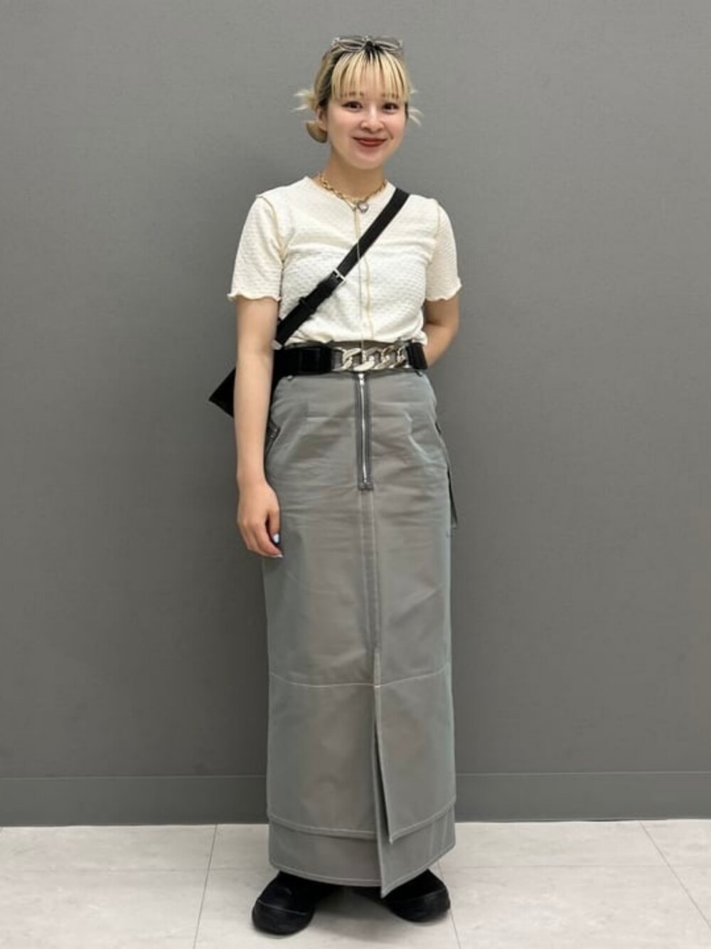 【一枚で主役に♡】ポケットとジップをあえて表に出しているタイトスカートです!ナカノが着用しているカラーはGREYですが、光の当たり方によって緑っぽくもなる色味です。前後どちらでも着用できる優れものなのです!Tシャツはコンパクトなシルエットで、ワンピースのインナーなどにも使えます!ホワイトは若干透けがある為、下着は響かないものが良さそうです◎ Ray BEAMS / ナカノ アイ