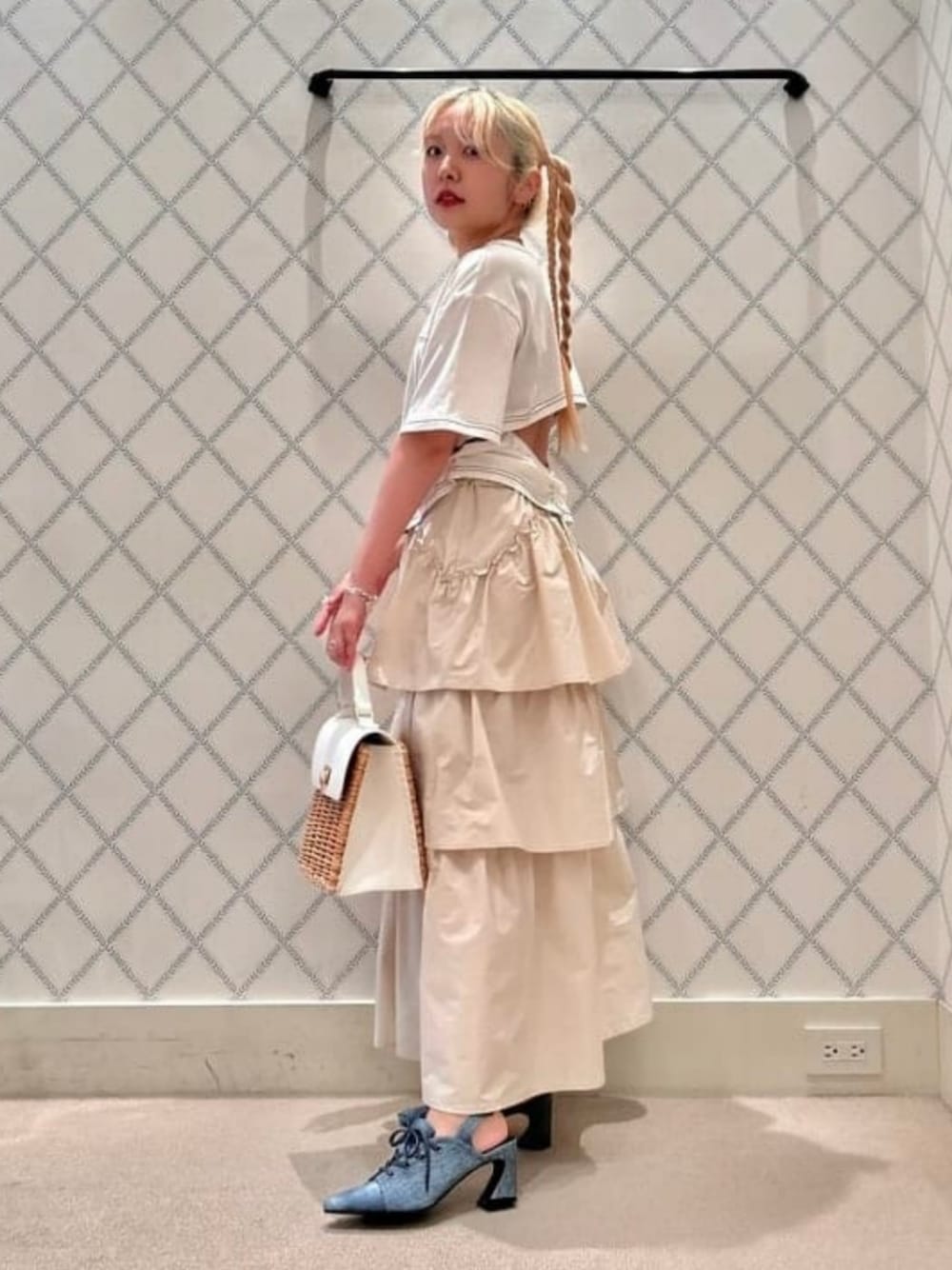 Tシャツにスカートのシンプルかわいいスタイリング♡Tシャツは背中の空きを調節できるので肌見せが楽しめます。ボリュームたっぷりのティアードスカートは152cm/サイズ0でぴったりでした! ビームス 銀座 / haru