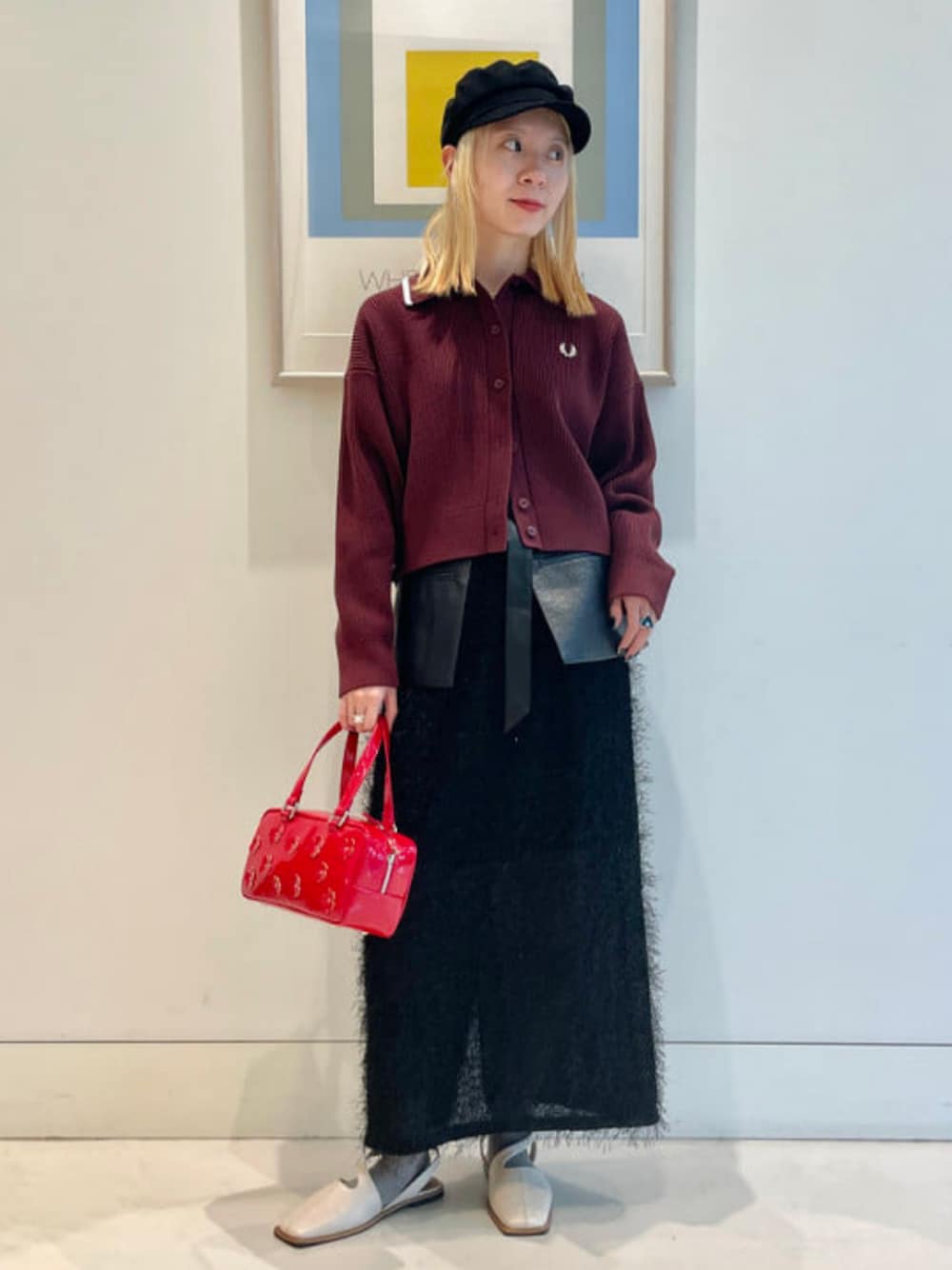 毎シーズン大人気の〈FRED PERRY〉別注☆今年の秋冬も、カーディガンのご用意がございますっ!私の推しは、深い色味がシックなOXBLOOD。ボルドーのような秋らしいカラーです!フリーサイズですが、身幅はゆったり。162cmの私で腰くらいの、やや短丈な作り出す。ボリュームのあるスカートやワンピースとも相性抜群☆女性らしくスカートと合わせてみました!カーディガンの色味に合わせて、バッグも赤で。お花のモチーフが散りばめられていてかわいい♡ ビーミング ライフストア by ビームス グランエミオ所沢店 / デグチ アツミ