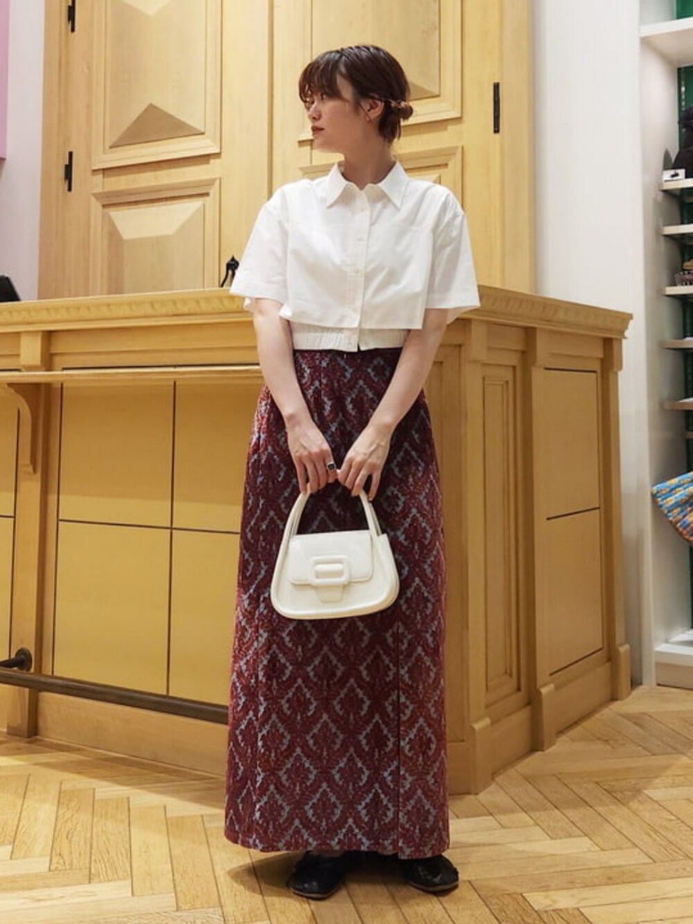 【秋冬に一枚持っておきたい!】ジャガード生地のスカートは一枚で華やかな雰囲気に見せてくれるので、秋冬は一着あると重宝しますよね~!長めの着丈が好きなので、160cmでサイズ1を着用。ウエストはサイズ0がジャストです◎バックスリットデザインですが、少しずらしてスリットを前にして着てみました。 レイ ビームス 新宿 / saori KATO