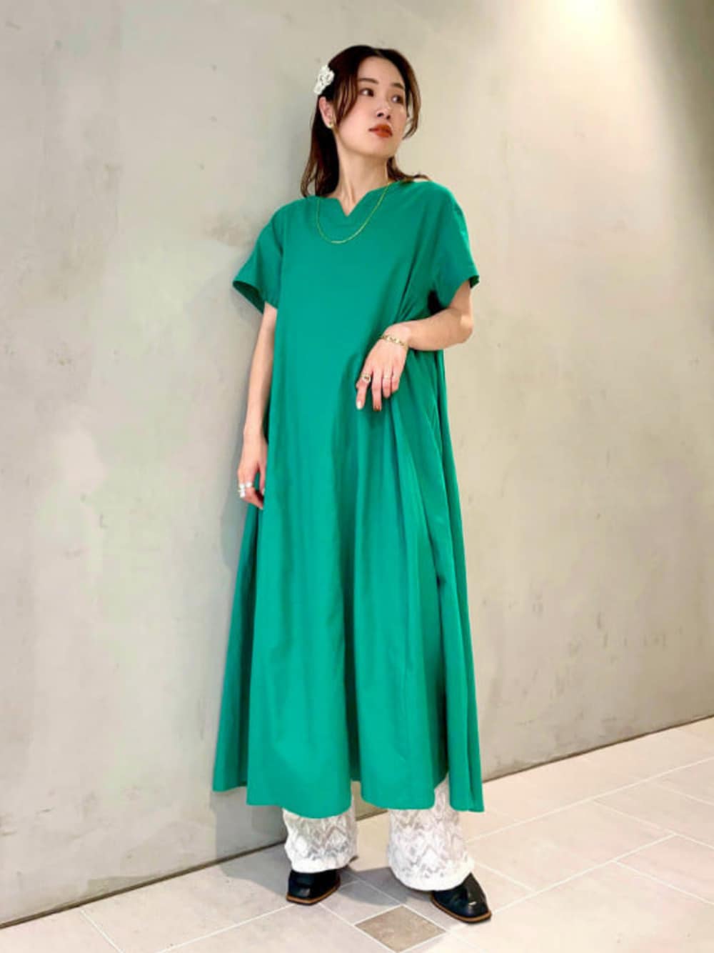 【これからの時期、1枚あると大活躍!】<Ray BEAMS>のワンピースは麻が入っていてとても爽やか〜!パキッとしたグリーンはコーディネートの主役になりますよ◎後ろ姿も素敵なのでスワイプして要チェックです★155cmの身長の私でも足首上の丈だったので裾からレースパンツを覗かせたのがポイント。 Ray BEAMS / カタヤマ アヤ