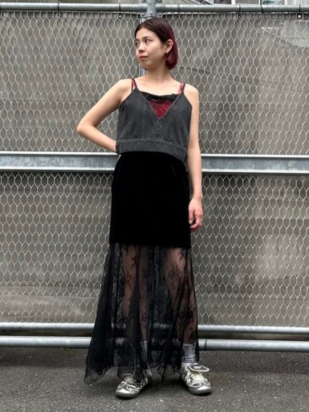 【新作のレースアイテム】夏のブラックコーディネート。レースは甘い印象が強いですが、デニム素材やスニーカーを合わせることでカジュアルダウン。赤の差し色が今年っぽくて個人的にポイントです! ビームス 吉祥寺 / Nagumo Yuki